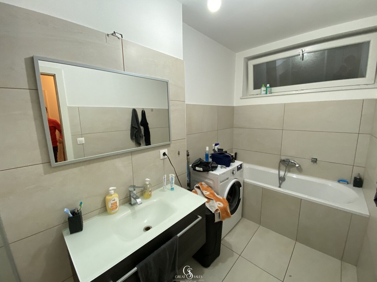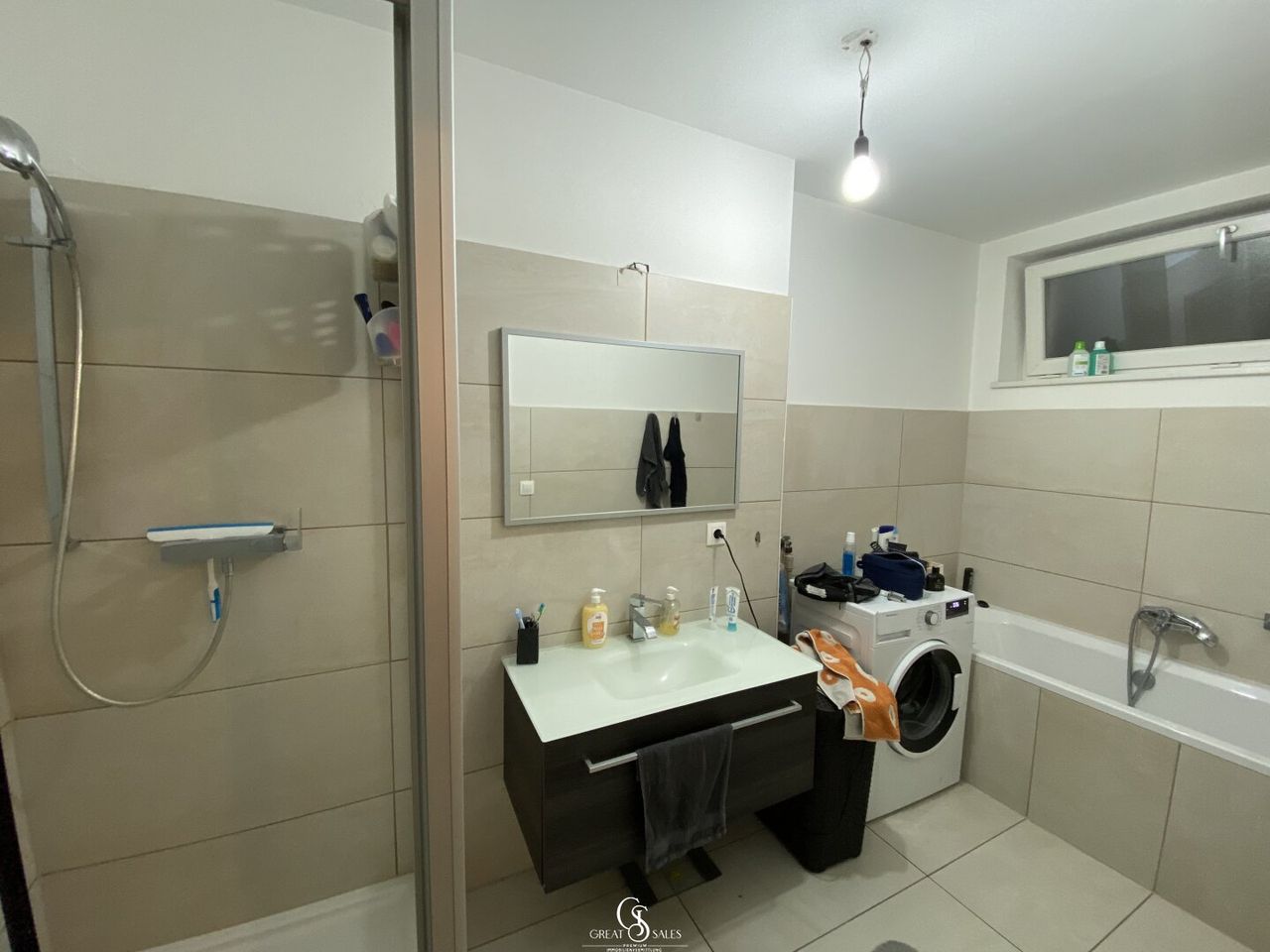 - einem Badezimmer (Dusche, Badewanne, Spiegel, Waschbecken mit Verbau, Waschmaschinenanschluss und Fenster)