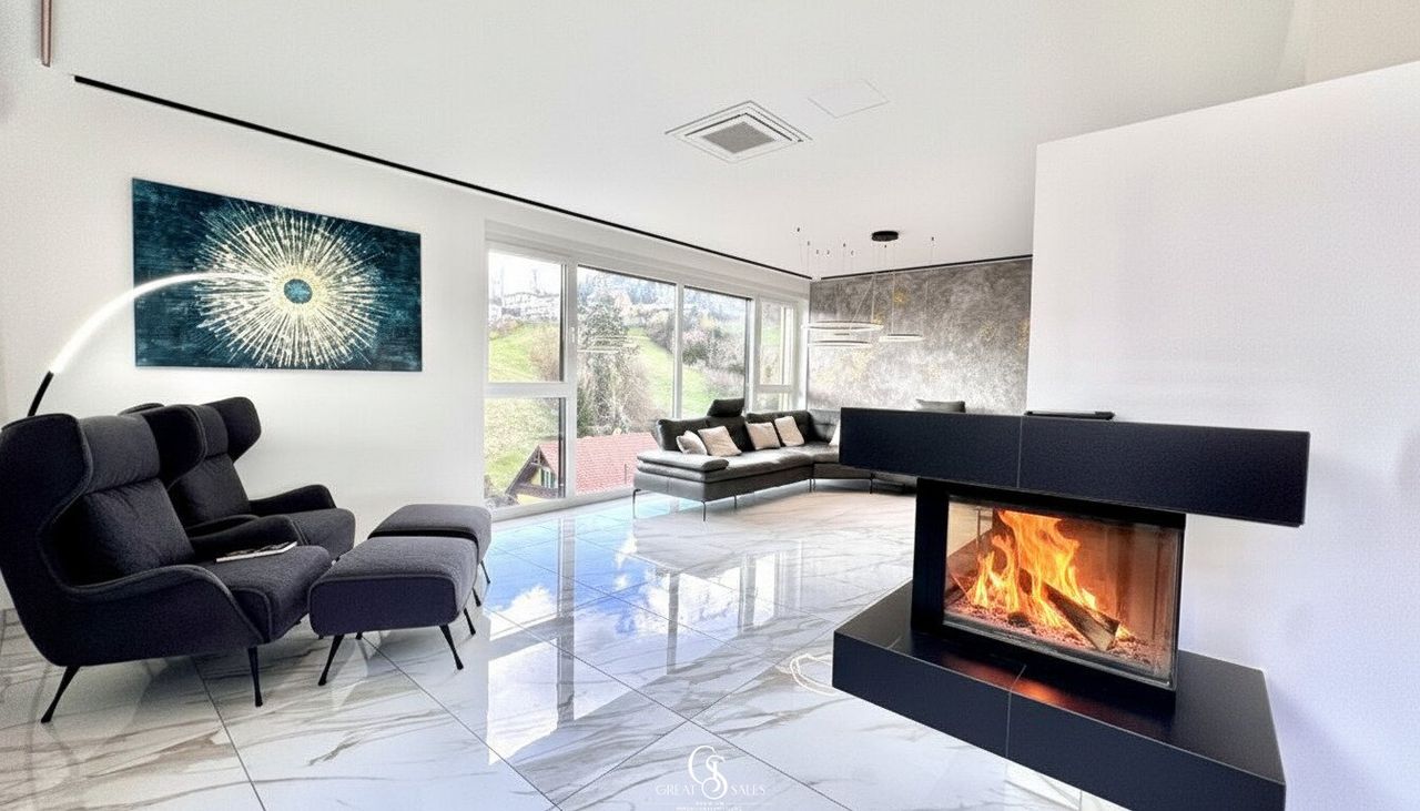 Die großzügigen Fenster- und Glasflächen, welche bis zum Boden reichen, schaffen sehr helle und lichtdurchflutende Räume. Diese können auch durch elektrisch betriebene Raffstores über das BUS-System ausreichend abgedunkelt werden.