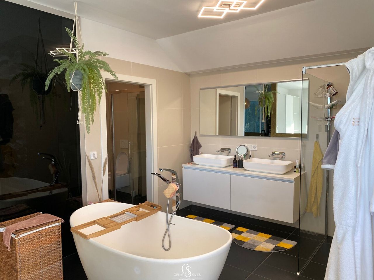 - Einem großen, offenen Bad. Dieses ist mit zwei Waschbecken, einer freistehenden Badewanne, einer begehbaren Dusche und einem Waschmaschinen-Anschluss ausgestattet. Außerdem haben Sie direkten Zugang zu einem einem begehbaren Ankleideraum und zur West-Terrasse.