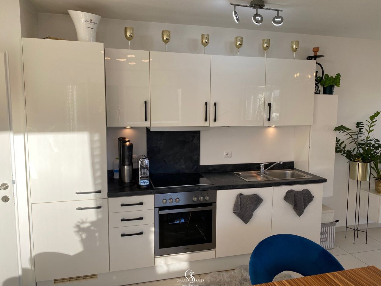 Auch die Küche, welche aus Herd, Backofen, Dunstabzug, Geschirrspüler, Kühlschrank, Tiefkühlfächer und sämtlichen Kästen besteht, ist in einem sehr ansprechenden Design gehalten.
