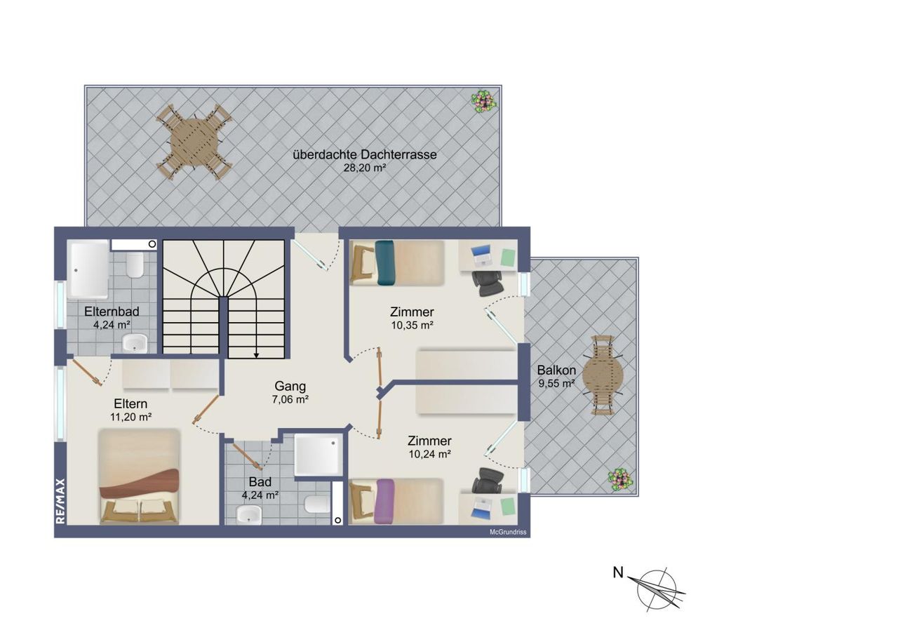 Im Obergeschoß befindet sich das private Refugium mit weiteren Zimmern und einem zusätzlichen Highlight: einer ca. 28,20 m² großen Flachdachterrasse, die nach Osten ausgerichtet ist und so den perfekten Platz für ein sonniges Frühstück oder die erste Tasse Kaffee am Morgen bietet.