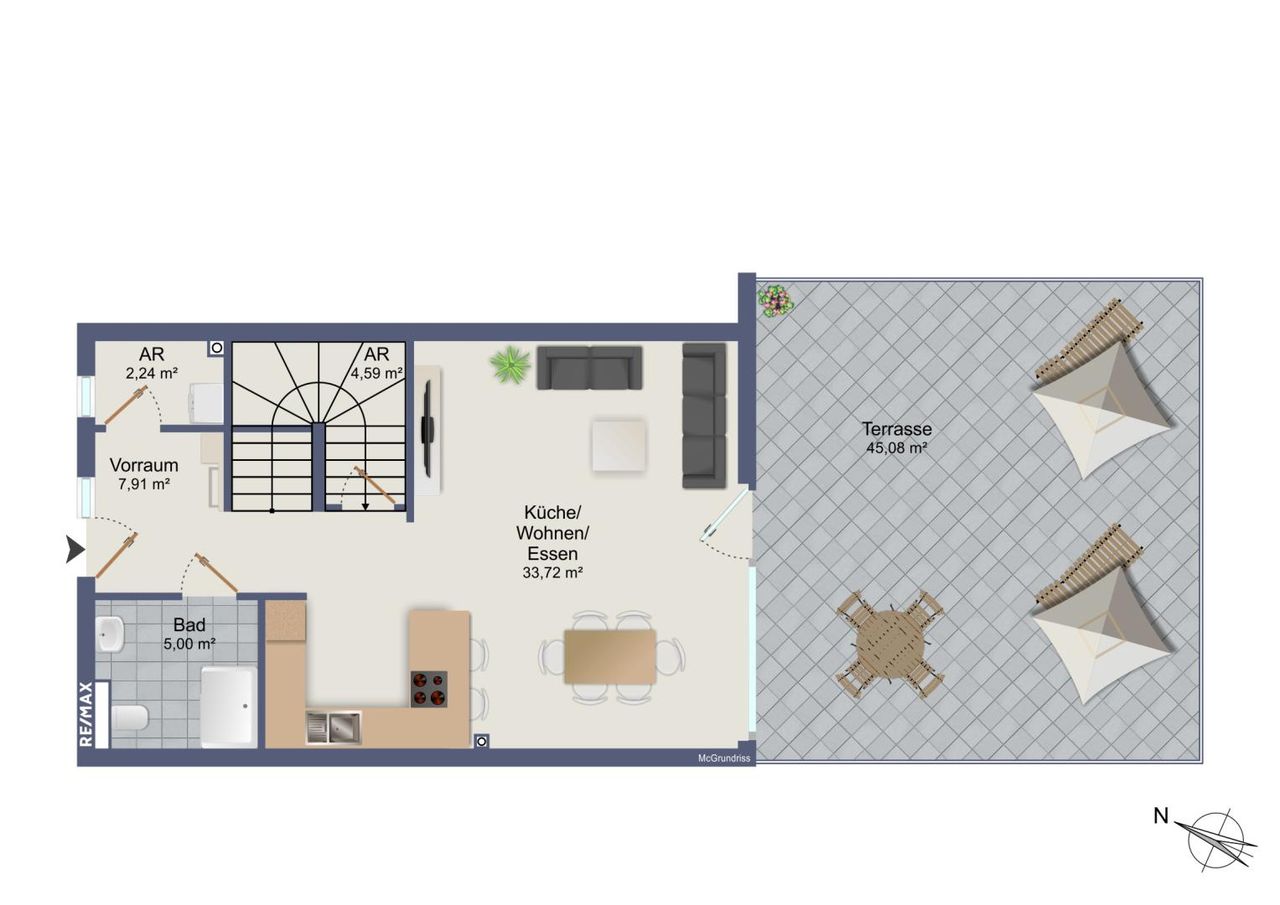 Das Untergeschoß überzeugt mit einem offenen Wohn-/Essbereich mit Küche, der direkt Zugang zu den großzügigen Freiflächen bietet. Hier erwartet Sie eine ca. 45,08 m² große Südterrasse, die Sonne von früh bis spät garantiert, sowie ein gepflegter Gartenanteil von ca. 32,50 m² – ideal zum Entspannen, Spielen oder gemütlichen Beisammensein im Grünen.