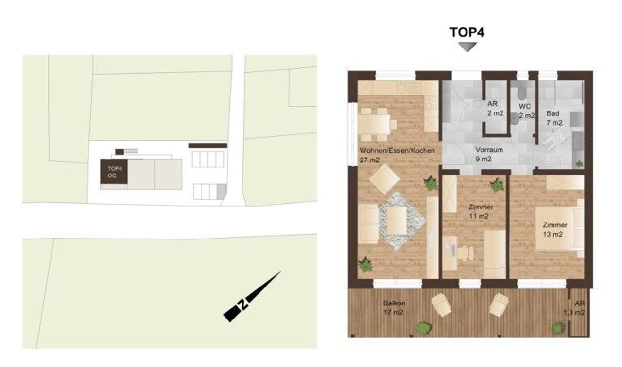 Für mehr Stauraum steht ein Kellerersatzraum und ein Abstellraum auf der Terrasse oder dem Balkon zur Verfügung und jeder Wohnung sind 2 überdachte Autoabstellplätze zugeordnet.