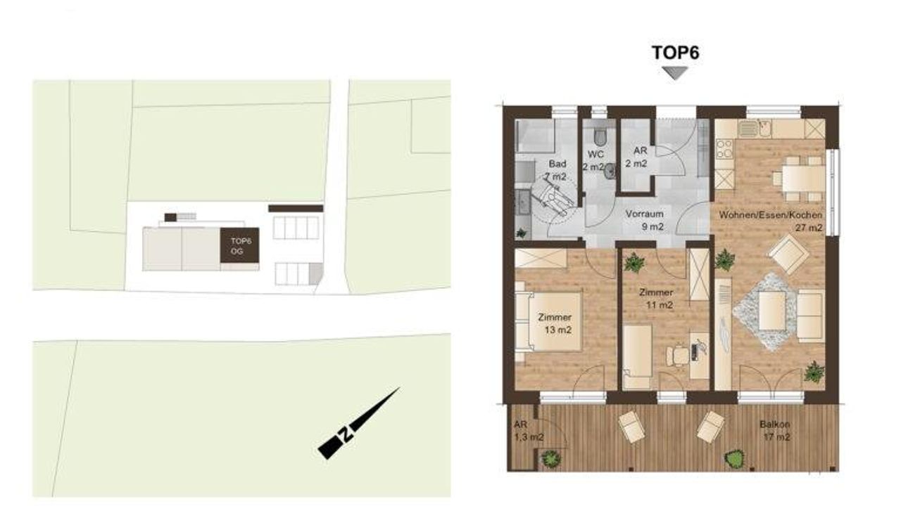 Die Wohnung bietet einen großzügigen Wohn-/Essbereich mit einer offenen Küche, zwei Schlafzimmer, einen Vorraum, ein Badezimmer, einen Abstellraum und ein WC.