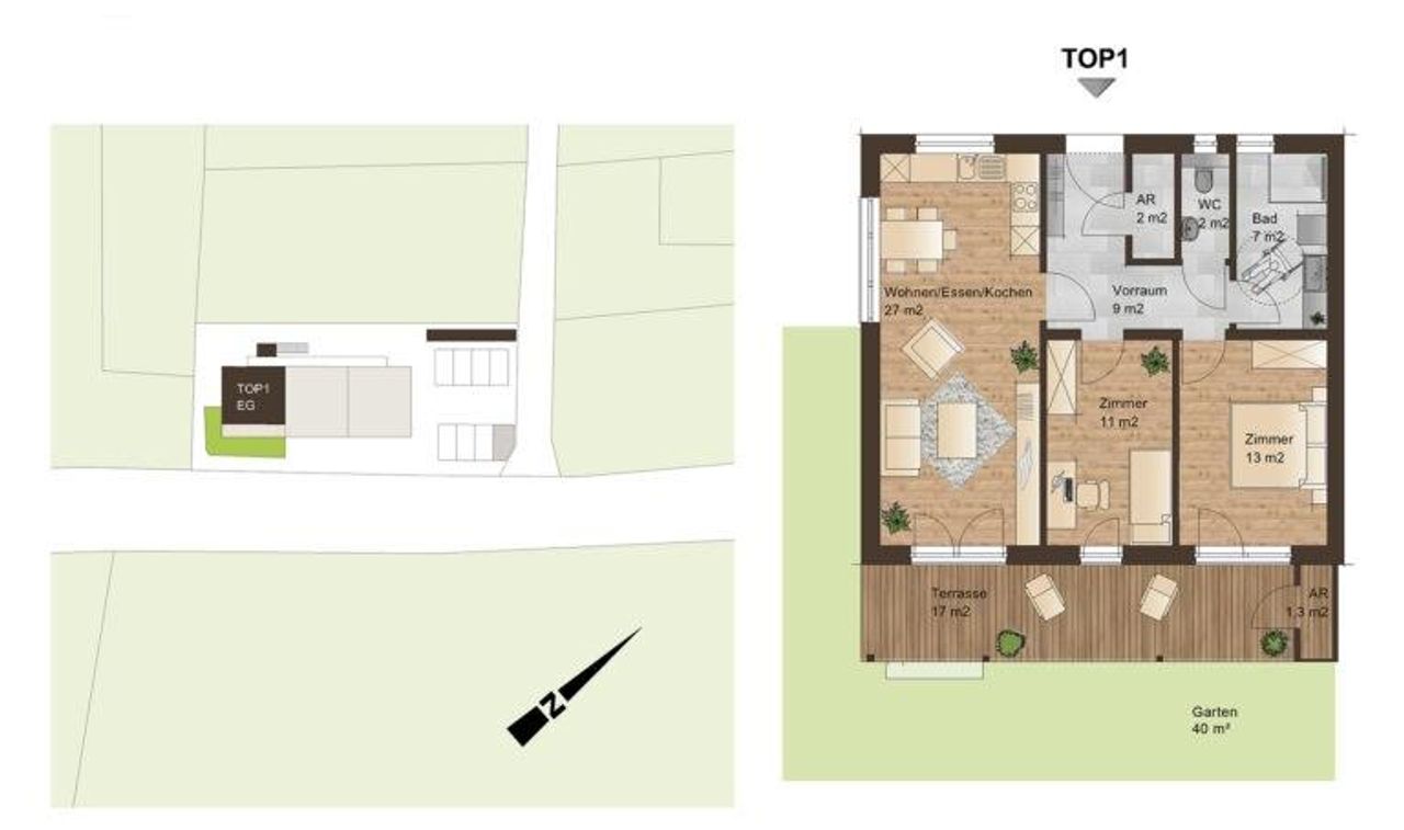 Für mehr Stauraum steht ein Kellerersatzraum und ein Abstellraum auf der Terrasse oder dem Balkon zur Verfügung und jeder Wohnung sind 2 überdachte Autoabstellplätze zugeordnet.