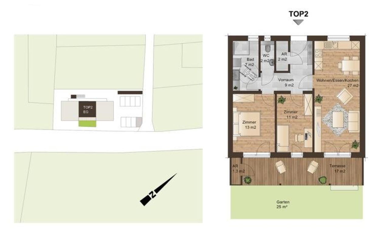 Für mehr Stauraum steht ein Kellerersatzraum und ein Abstellraum auf der Terrasse oder dem Balkon zur Verfügung und jeder Wohnung sind 2 überdachte Autoabstellplätze zugeordnet.