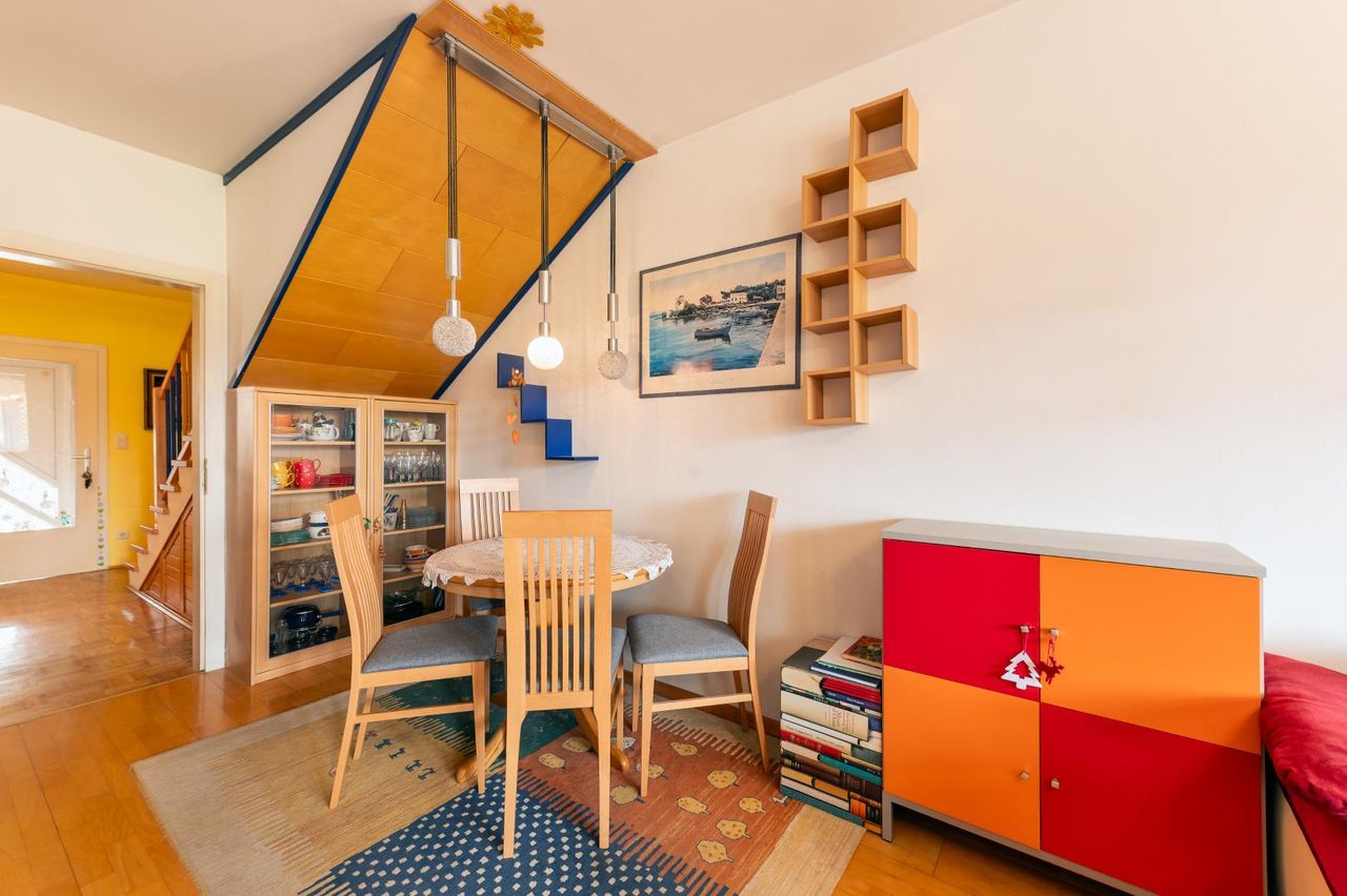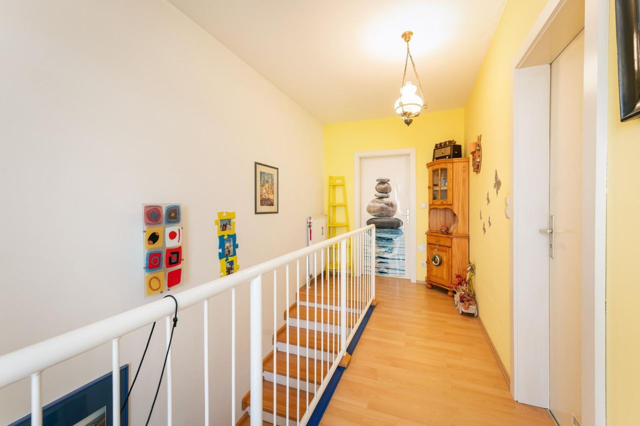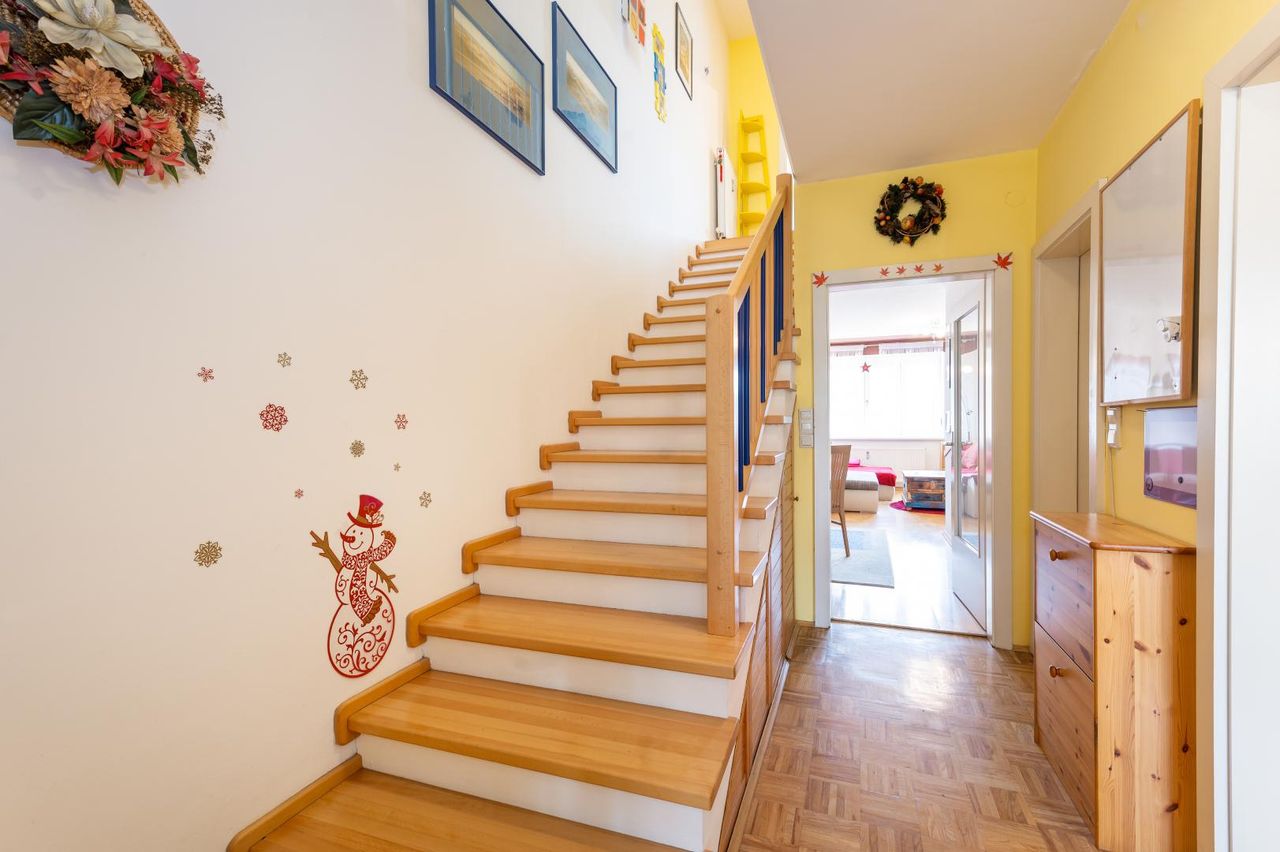 Das Wohnen findet auf zwei Ebenen statt. Alle Zimmer sind getrennt begehbar. Vom Koch-/Wohn-/Essbereich gelangen Sie auf den sonnigen Süd-Ostbalkon. Das Highlight, die ca. 16 m² große West-Nordterrasse, ist vom Obergeschoss aus erreichbar.