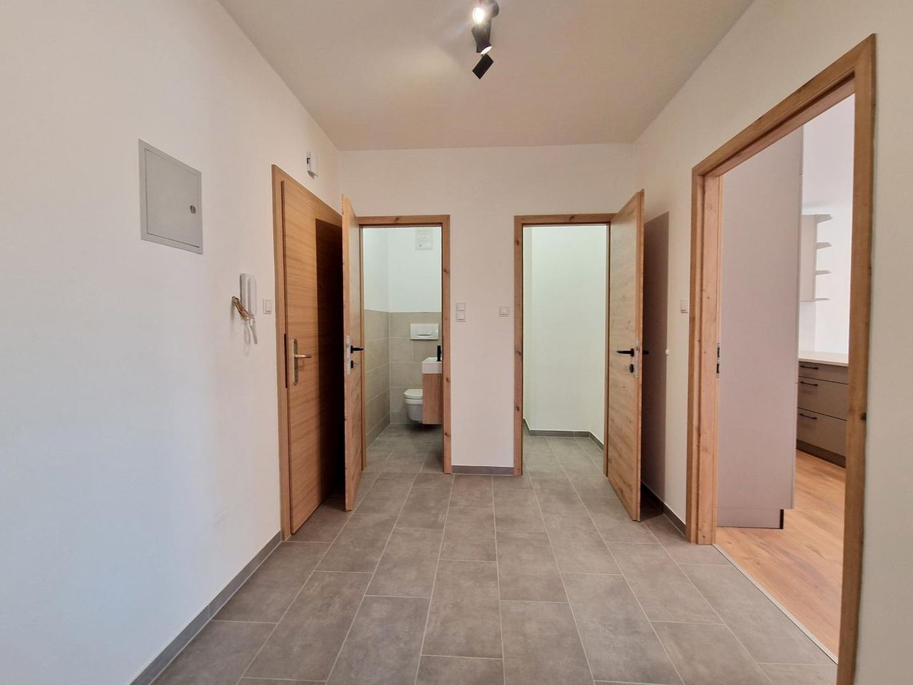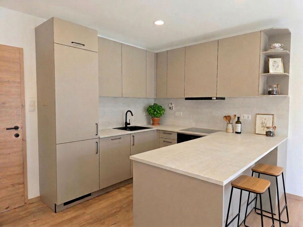 Die moderne Einbauküche fügt sich harmonisch ein und schafft einen idealen Raum zum Kochen, Wohnen und Genießen. Von hier aus gelangen Sie direkt auf die sonnige Loggia – perfekt für entspannte Stunden im Freien.