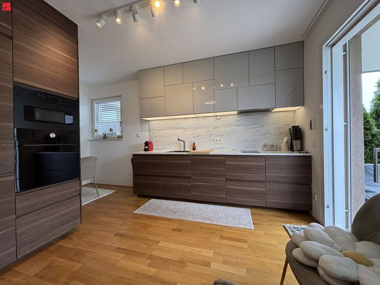 Die offene, stilvolle Küche ist mit hochwertigen Geräten, sowie reichlich Stauraummöglichkeiten ausgestattet. Im großzügigen Wohn- und Essbereich erwartet Sie eine Fensterfront, welche einen schönen Blick in den eigenen Garten bietet. Im Badezimmer finden Sie eine Dusche, einen Waschtisch aus hochwertigem Massivholz...
