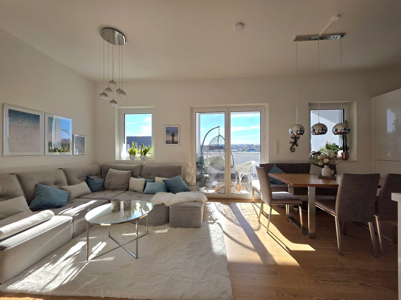 Das Herzstück der Wohnung ist die offene Wohnküche. Die moderne Einbauküche ist funktional und hochwertig ausgestattet, sodass Sie hier sofort loslegen können. Der sonnige Südbalkon lädt zum Entspannen ein und bietet einen herrlichen Ausblick. Perfekt für den ersten Kaffee am Morgen oder den Feierabend in der Abendsonne. Dank der Klimaanlage genießen Sie auch an heißen Sommertagen angenehme Temperaturen.