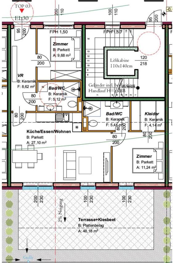 ca. 71 m² Wohnfläche, ca. 48 m² Terrasse, Lift vorhanden, 3 Zimmer, Ankleidezimmer, Nahwärme/Fußbodenheizung, Parkett und Fliesen
