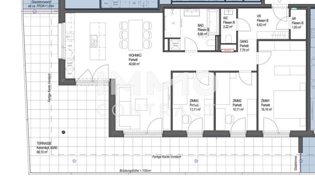 Raumaufteilung: Vorraum, Abstellraum, WC, Gang, Bad, 3 Schlafzimmer, Wohn-Essküche (Küche nicht möbliert), Terrasse. Die großzügige Freifläche ermöglicht einen traumhaften Ausblick und schafft somit zusätzliche Lebensqualität.