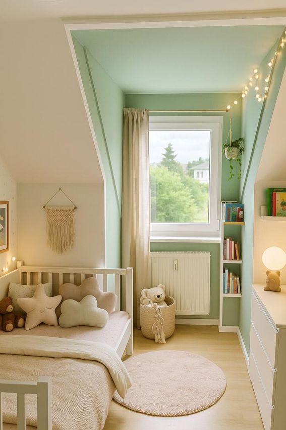 Eine gefällige Holztreppe führt in das Dachgeschoss mit zwei Schlafzimmer mit Gaupenfenster, einem Bad und einem Vorraum.
