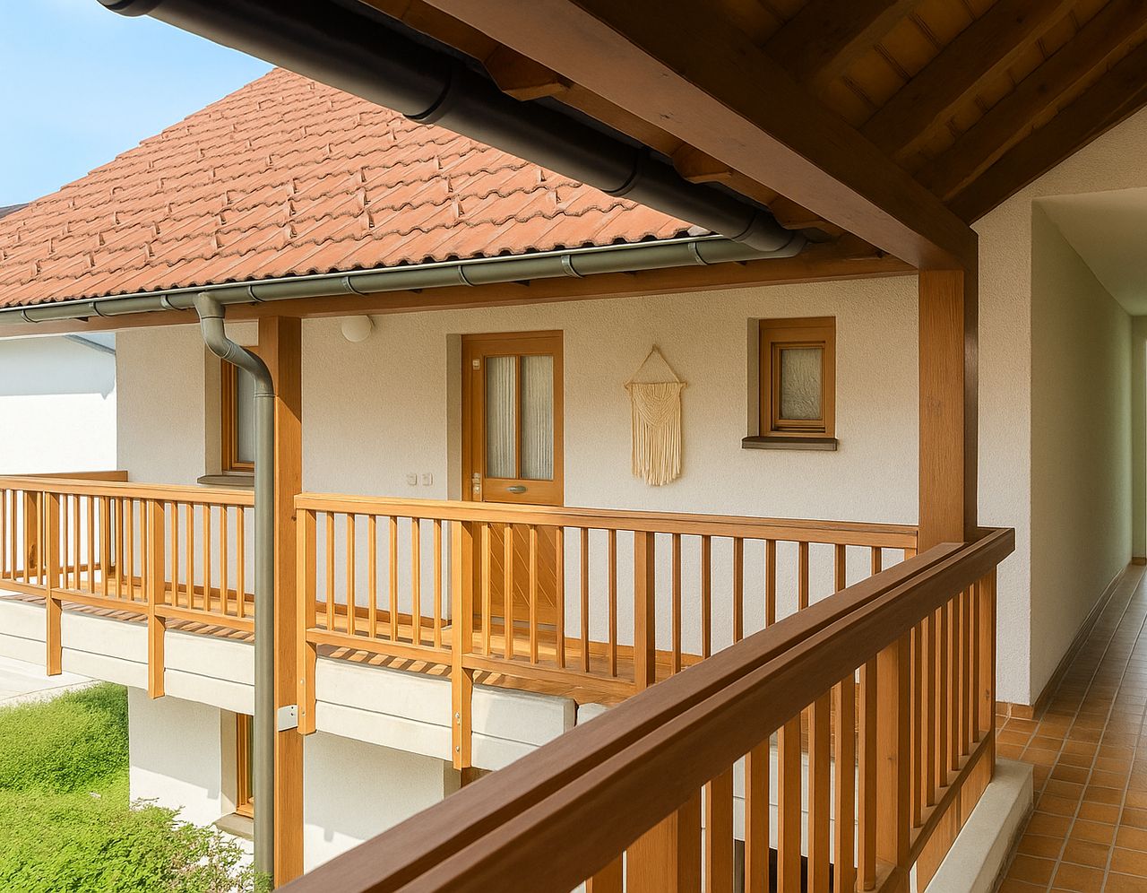 Auf der ersten Wohnebene im ersten Obergeschoss die über einen schönen Laubengang erreichbar ist, befinden sich ein attraktives Wohn-Esszimmer mit Ausgang auf eine Loggia mit Charme, ein Büro- oder Gästezimmer, ein großzügige Diele, ein WC sowie ein Abstellraum.