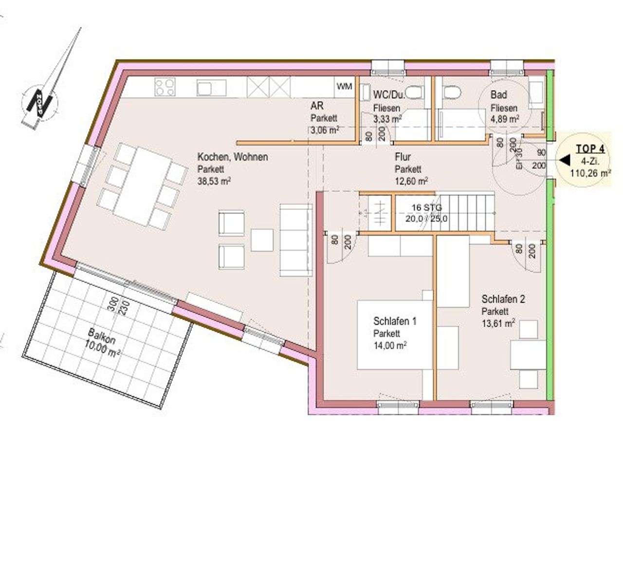 Obwohl diese Maisonette-Wohnung das Gefühl vom „Haus im Haus“ vermittelt, kann man die 4-Zimmer-Wohnung schnell zusperren, verreisen, weg sein – ohne sich um das „Haus“ fürchten oder kümmern zu müssen. Ob Altersvorsorge, bequemes Wohnen oder Großeinkauf: Ein Lift vom Auto in der Tiefgarage in den 2. Stock ist hier jedenfalls ein weiteres Plus.