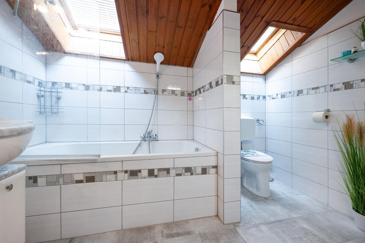 2015 wurde das Badezimmer renoviert, ausgestattet mit Badewanne, Waschtisch, Toilette und Waschmaschinenanschluss. Zwei Dachfenster lassen viel Tageslicht herein und sorgen für eine angenehme Belüftung.