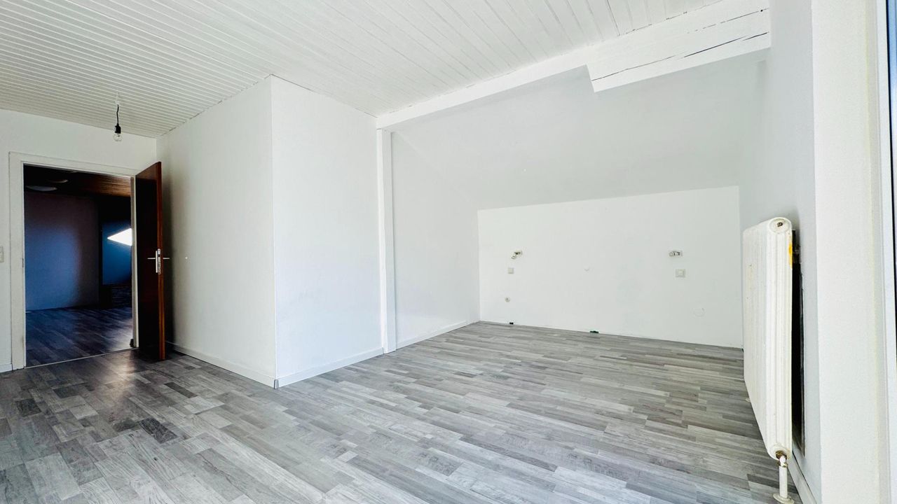 Das ca. 26,95 m² große Wohnzimmer besticht durch zwei Dachfenster und einen dekorativen Holzbalken, der die Holzdecke akzentuiert. Ein graumelierter Laminatboden wurde vor fünf Jahren erneuert und schafft eine einladende Atmosphäre. Eine kleine Tür im Wohnzimmer führt Sie in den ca. 40 m² großen Dachboden, der reichlich Stauraum bietet.