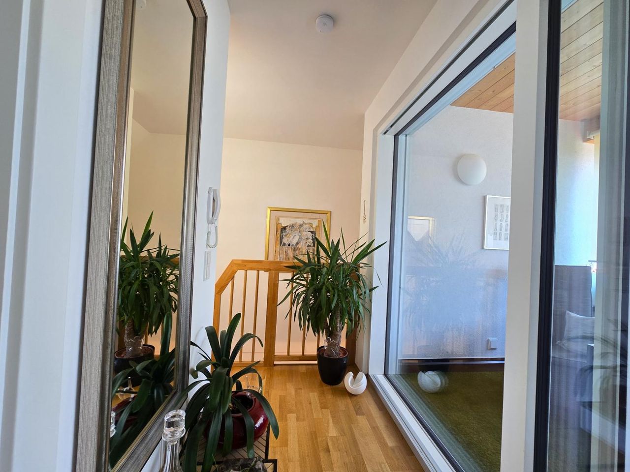 Diese stilvolle Wohnung erstreckt sich über das erste und zweite Obergeschoss eines gepflegten Gebäudes. Eine interne Treppe im Eingangsbereich sorgt für zusätzliche Privatsphäre.