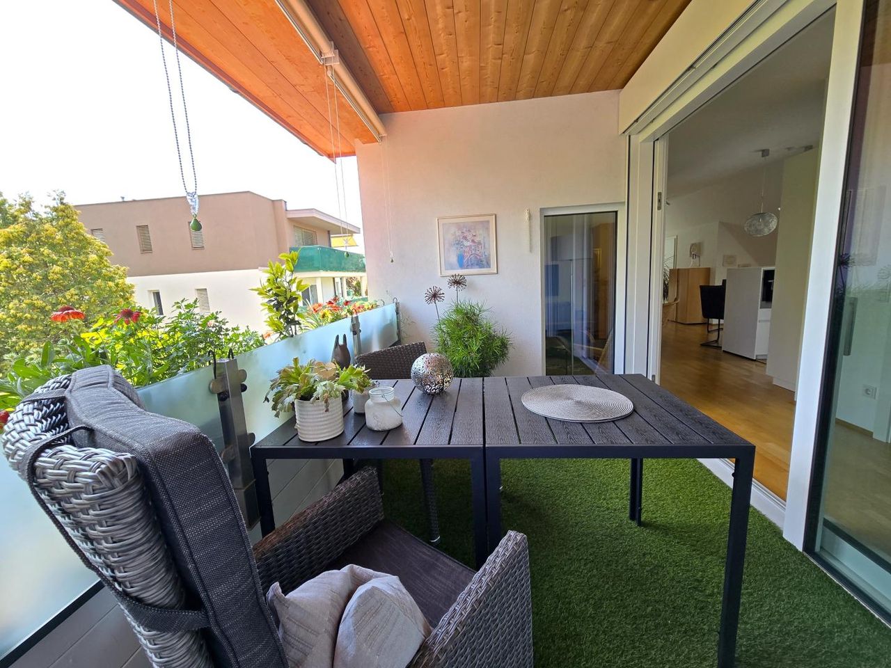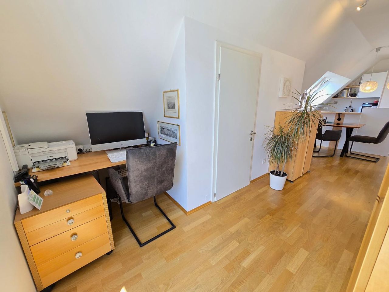 Diese stilvolle Wohnung erstreckt sich über das erste und zweite Obergeschoss eines gepflegten Gebäudes. Eine interne Treppe im Eingangsbereich sorgt für zusätzliche Privatsphäre. Der erste Raum umfasst ein Wohnzimmer mit Küche, Essbereich sowie eine praktische Arbeitsnische. Von hier gelangt man auf eine sonnige Loggia mit Sonnenschutz, die zum Entspannen einlädt. Angrenzend befinden sich das Schlafzimmer, ein modernes Badezimmer und eine Abstellkammer. Zusätzlich bietet ein separates Kellerrabteil Stauraum. Komfort wird durch hochwertige Ausstattung großgeschrieben: Die Fenster sind mit Dreifachverglasung versehen, elektrische Rollos und Lamellen sorgen für angenehme Lichtregulierung. Die Räume werden durch eine Fußbodenheizung mit Fernwärme beheizt. Eine Klimaanlage ist bereits...