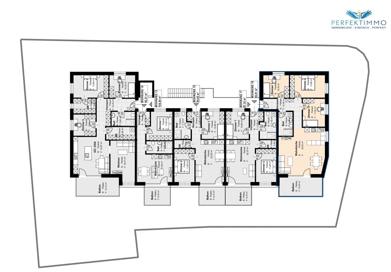 17 moderne Wohnungen auf drei Etagen mit großzügigen Freiflächen (Balkone, Terrassen, Gärten)