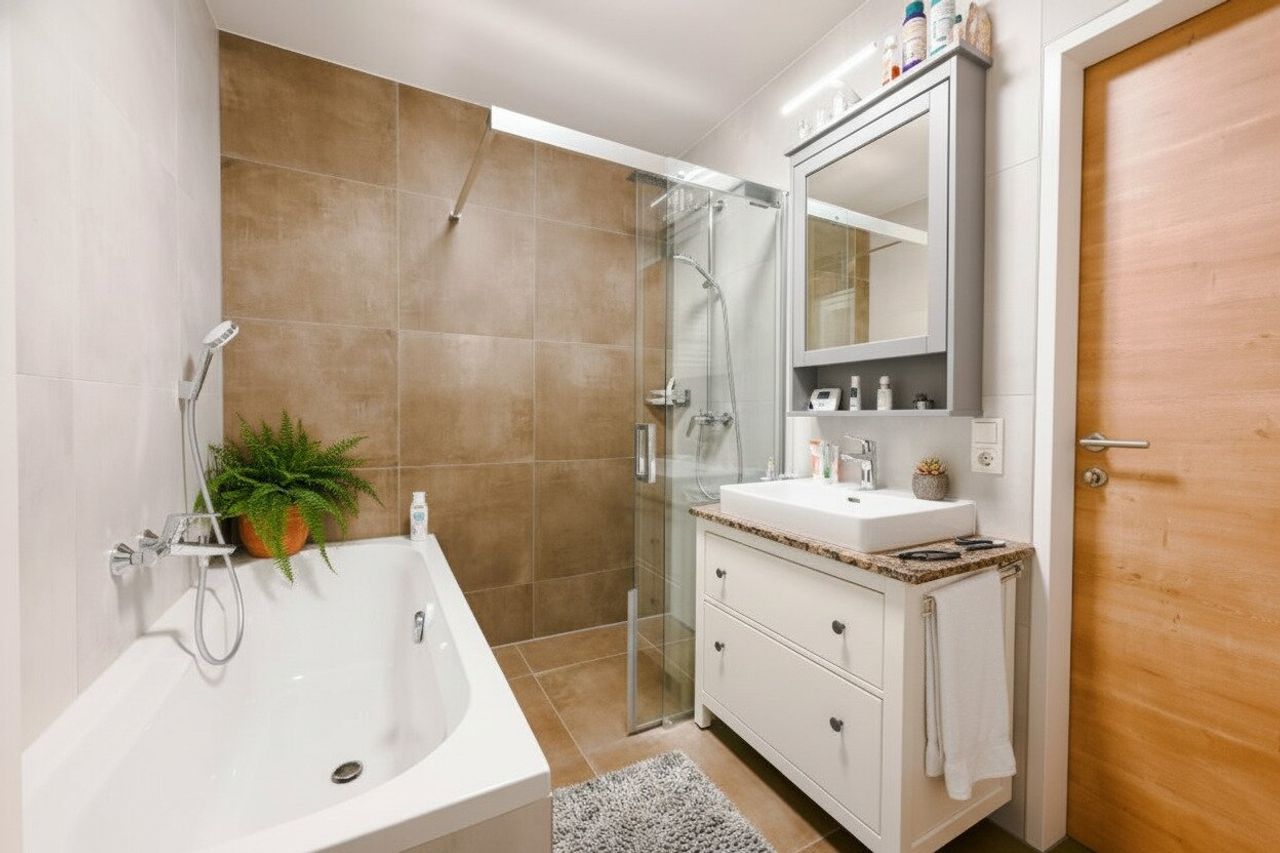 - Bad mit Regendusche, Badewanne, Waschtisch, Handtuchtrockner und Nische für Waschmaschine und Trockner