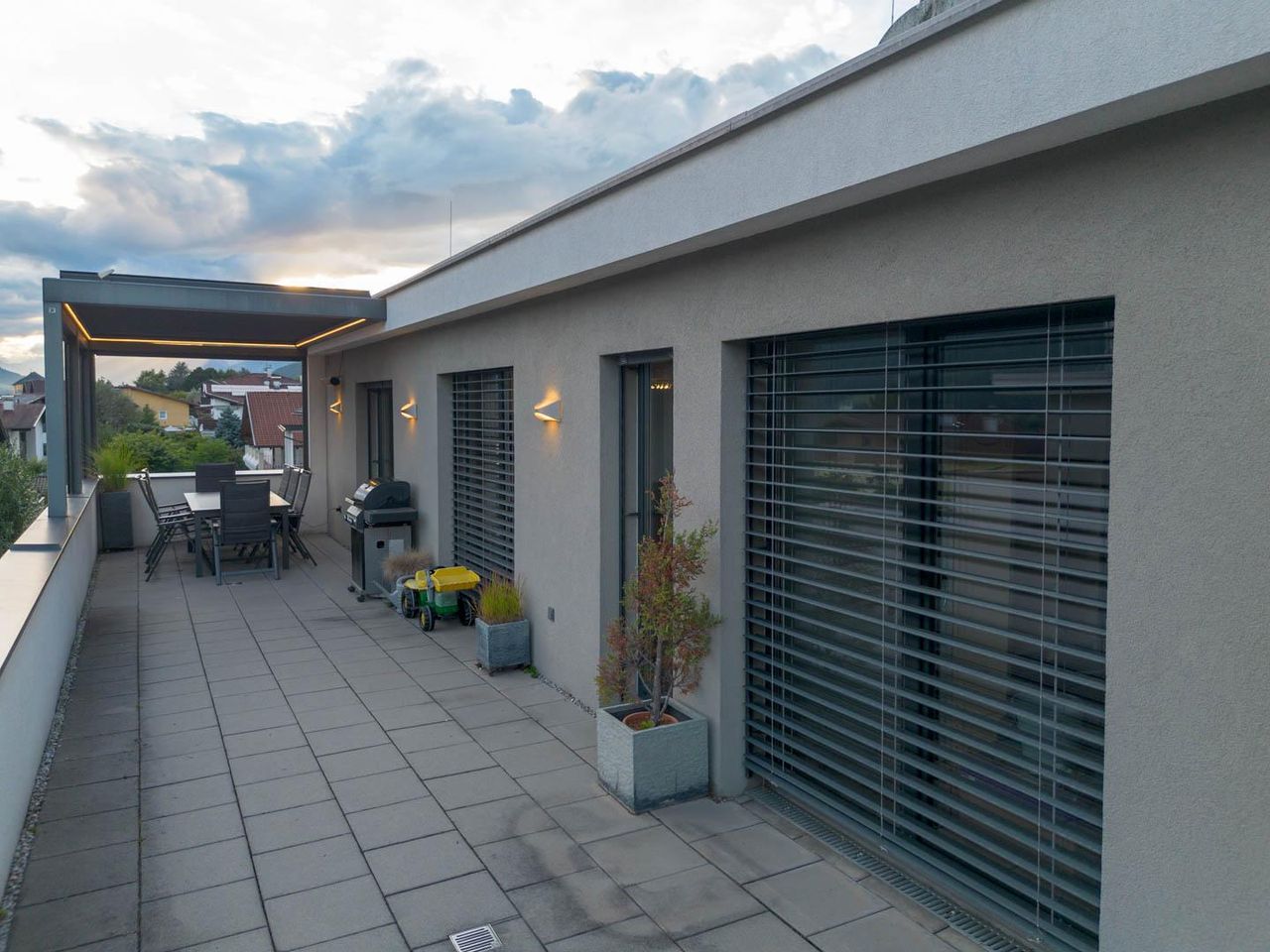 Besonderheiten: Die Wohnung überzeugt durch ihre großzügige, nahezu umlaufende 360°-Terrasse, auf der sich auf der Südseite eine beheizte Pergola mit elektrisch verstellbarem Aluminium-Rafflamellendach befindet. Ergänzend gibt es einen südseitigen Balkon. Im separaten Kellerraum ist ein Fitnessstudio eingerichtet. Sämtliche Räume verfügen über Raffstores, überwiegend elektrisch.