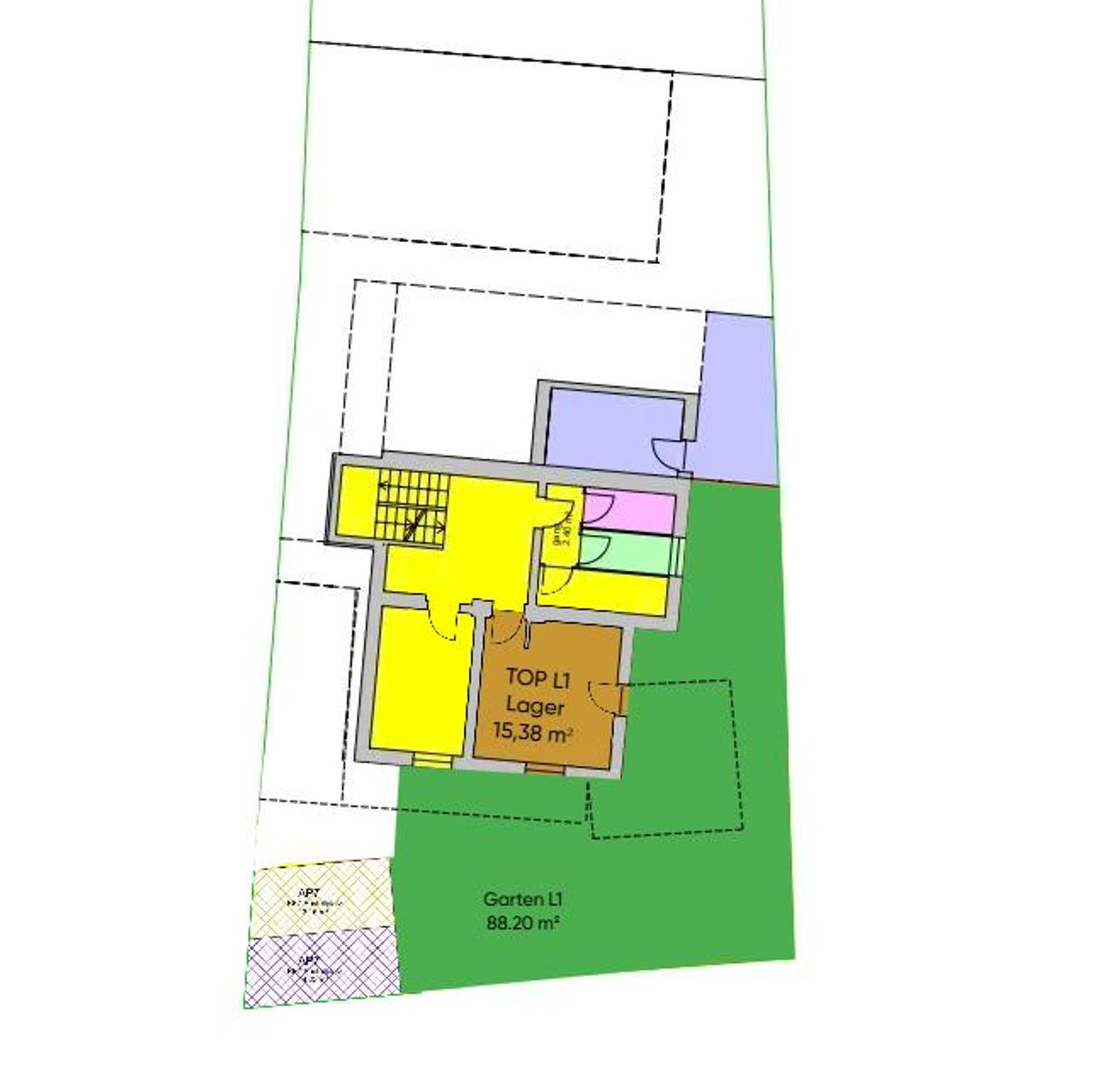 Der rund 88 m² große Garten bietet ausreichend Platz für individuelle Gestaltung – ob als stilvolle Chill-Out-Area, urbaner Gemüsegarten oder persönlicher Erholungsraum. Anders als bei klassischen Gartenparzellen profitieren Sie hier zusätzlich von einer geschlossenen Einheit im Gebäude (ca. 15 m²), die vielseitig nutzbar ist.