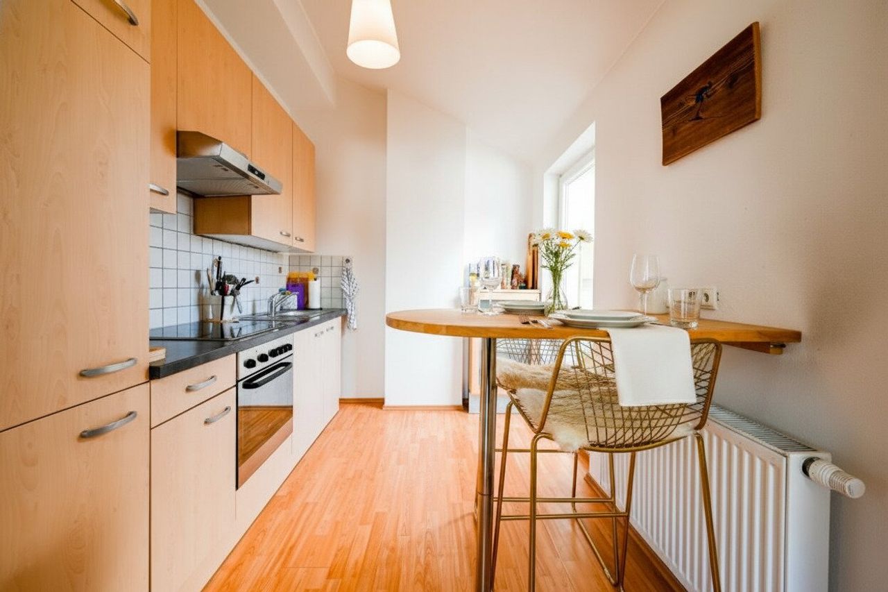 Die Wohnung besticht durch zwei helle Zimmer ausgestattet mit Fenstern und Oberlichten, die ein lichtdurchflutetes Ambiente schafft – perfekt für entspannte Stunden zu Hause. Die moderne Einbauküche ist funktional ausgestattet und lädt zum Kochen ein. Das Badezimmer mit Dachfenster, Badewanne,Waschtisch, WC und Waschmaschinenanschluss sorgt für Wohlfühlmomente und Tageslicht, das für eine angenehme Atmosphäre sorgt.