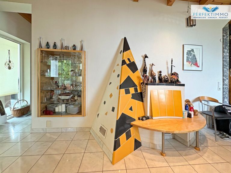 Das Erdgeschoss besticht durch helle, großzügig geschnittene Wohnräume, eine elegante Einbauküche sowie einen gemütlichen Kachelofen, der besonders in der Übergangszeit für behagliche Wärme sorgt. Die Beheizung erfolgt über eine zentrale Öl-Zentralheizung in Kombination mit Radiatoren und Fußbodenheizung, was für ein angenehmes Wohnklima sorgt. Ergänzt wird das Raumangebot durch einen ca. 9 m² großen Wintergarten, der sich ideal als Rückzugsort für entspannte Stunden oder als erweiterter Wohnraum nutzen lässt. Ein besonderes Highlight bildet der sichtbare Dachstuhl im Erdgeschoss, der dem Haus ein wohnliches und zugleich offenes Ambiente verleiht. Ein großes Badezimmer mit Eckbadewanne und Dusche sowie ein separates WC tragen zu einem hohem Wohnkomfort bei.