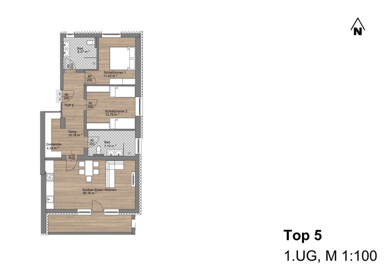 Das Ferienappartement Top 05 besteht aus einem großen Wohn- Küchenbereich, zwei geräumigen Schlafzimmern und zwei komplett ausgestatteten Badezimmern mit WC, Waschbecken, Waschbeckenunterschrank, LED Spiegel und eben begehbarer Rainshower-Dusche.