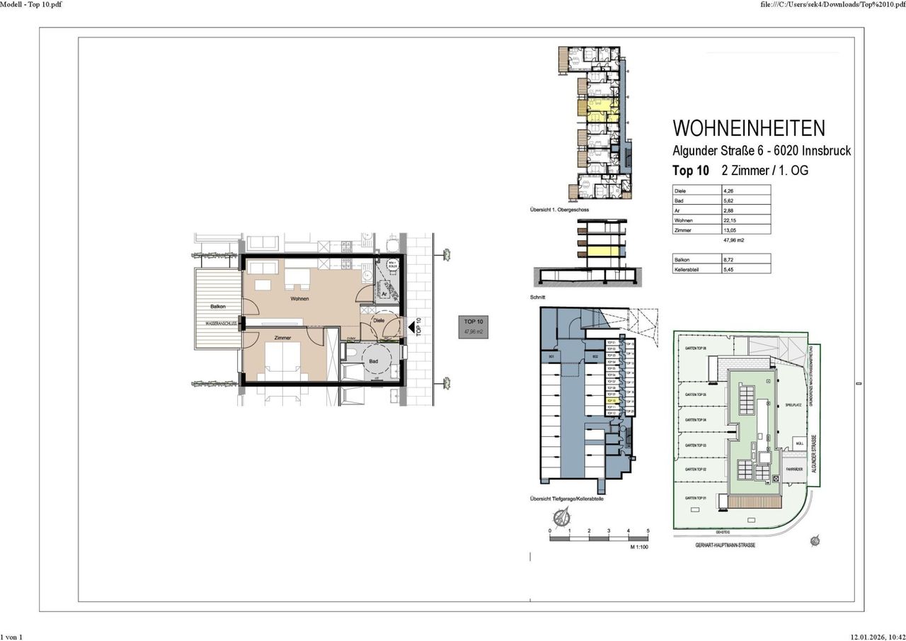 Neubauwohnungen im grünen Amras - PROVISIONSFREI für den Käufer In begehrter Lage von Innsbruck-Amras entsteht ein modernes Neubauprojekt mit 20 hochwertigen Eigentumswohnungen. Die 2- bis 4-Zimmer-Wohnungen sind alle nach Südwesten ausgerichtet und verfügen über Garten, Terrasse oder Balkon. Hochwertige Ausstattung, nachhaltige Energietechnik mit Luftwärmepumpe & Photovoltaik, Tiefgarage mit E-Lade-Vorbereitung sowie eine ausgezeichnete Infrastruktur mit Nähe zum DEZ, öffentlichen Verkehrsmitteln und vielfältigen Freizeitmöglichkeiten machen dieses Projekt besonders attraktiv. Die gegenständliche 2-Zimmer-Wohnung befindet sich im 1. Obergeschoß. Sie verfügt über eine Wohnfläche von ca. 47,96 m² und eine Balkonfläche von ca. 8,72 m². Ideal für Eigennutzer und Anleger Für nähere Informationen zur...