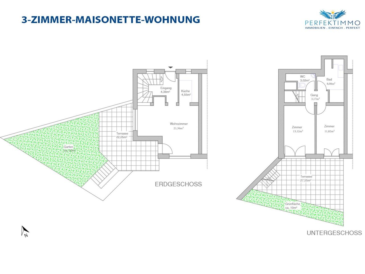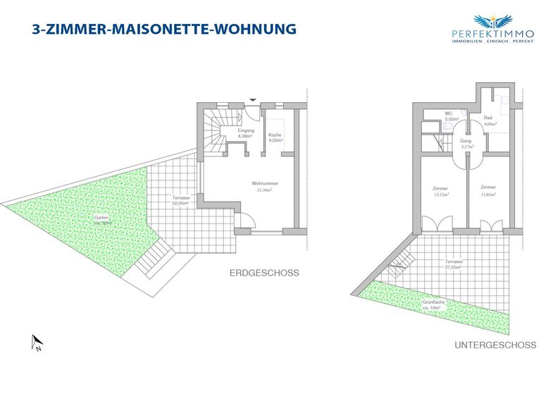 Die Wohnung erstreckt sich über zwei Etagen und verfügt über zwei großzügige Terrassen, die jeweils nach Süden bzw. Südwesten ausgerichtet sind. Genießen Sie sonnige Tage und malerische Sonnenuntergänge direkt vor Ihrer Tür. Ein weiteres Highlight ist der private Garten mit Grünfläche von ca. 42 m², wo man beispielsweise einen schönen, privaten Kräutergarten anlegen kann.