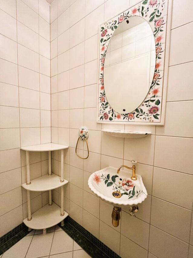 - Badezimmer mit Marmorwaschbecken, Wasserfall-Armatur, Badewanne und Waschmaschinenanschluss