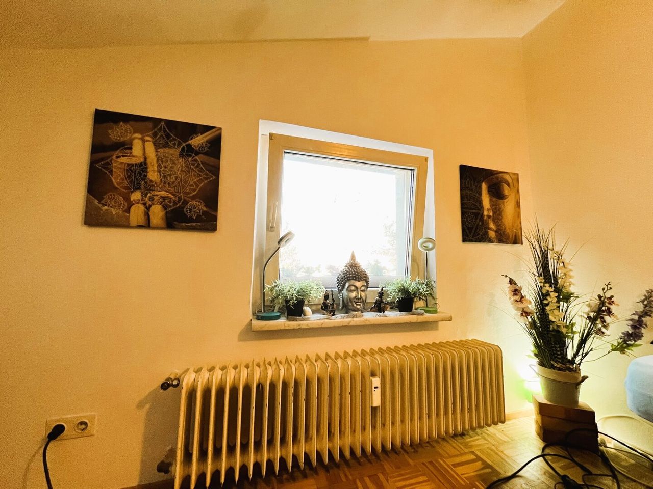 - Boden: Echtholzparkett (wurde ca. 2014 neu renoviert), Fliesen