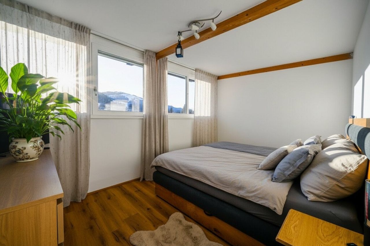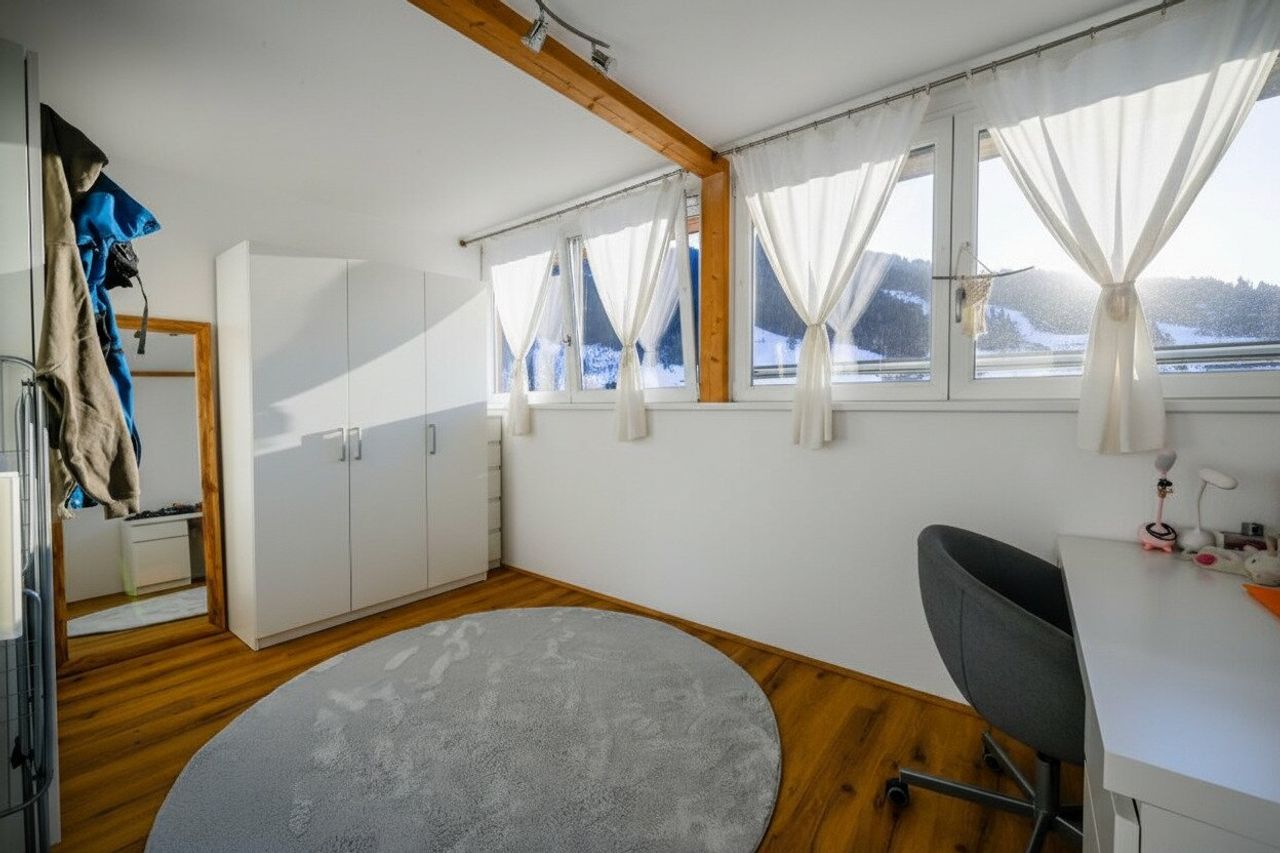 Zwei großzügige Schlafzimmer mit großen Fensterfronten bieten nicht nur viel Platz, sondern auch einen beeindruckenden Blick auf den Astberg und den Hartkaiser – ein Highlight für Naturliebhaber und Ruhesuchende.