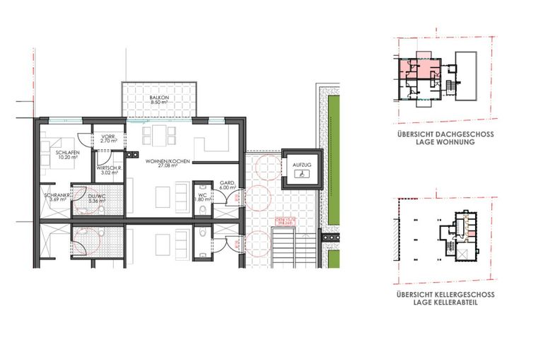 Die Wohnung Top 5 ist im Dachgeschoss gelegen. Über eine Diele mit Platz für die Garderobe kommen Sie in die Wohnung. Die Wohnung bietet ein Schlafzimmer mit Ankleide und ein Badezimmer mit Dusche. Das Highlight der Wohnung ist eine offene Wohnküche mit großen Fenster-Elementen und Zugang zum großzügigen Balkon. Komplettiert wird das Angebot mit einem Abstellraum mit Anschlüssen für Waschmaschine und Trockner sowie einem Gäste-WC.