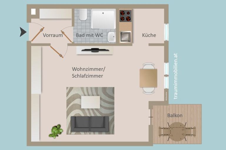 * Raumaufteilung: Vorraum, Badezimmer, Küche, Wohnzimmer/Schlafzimmer
