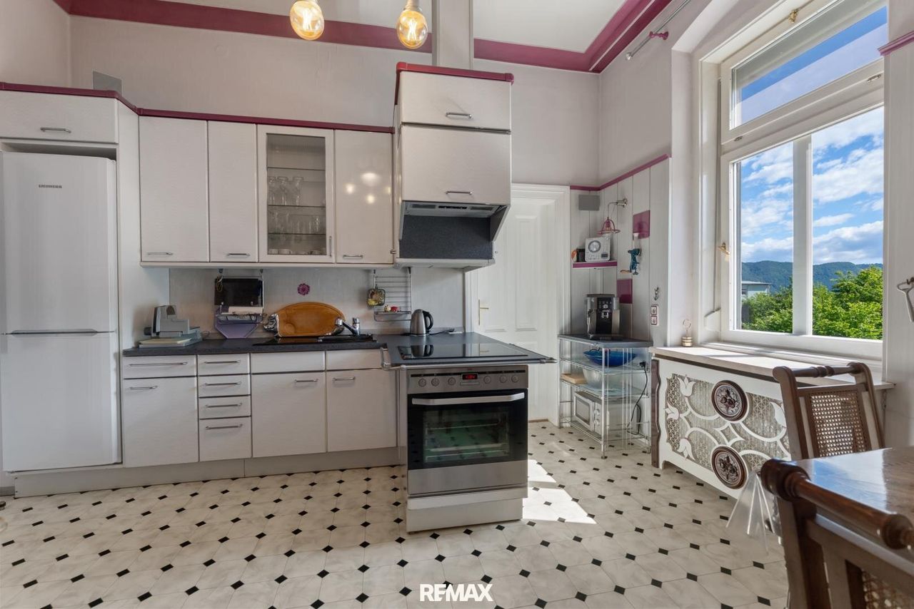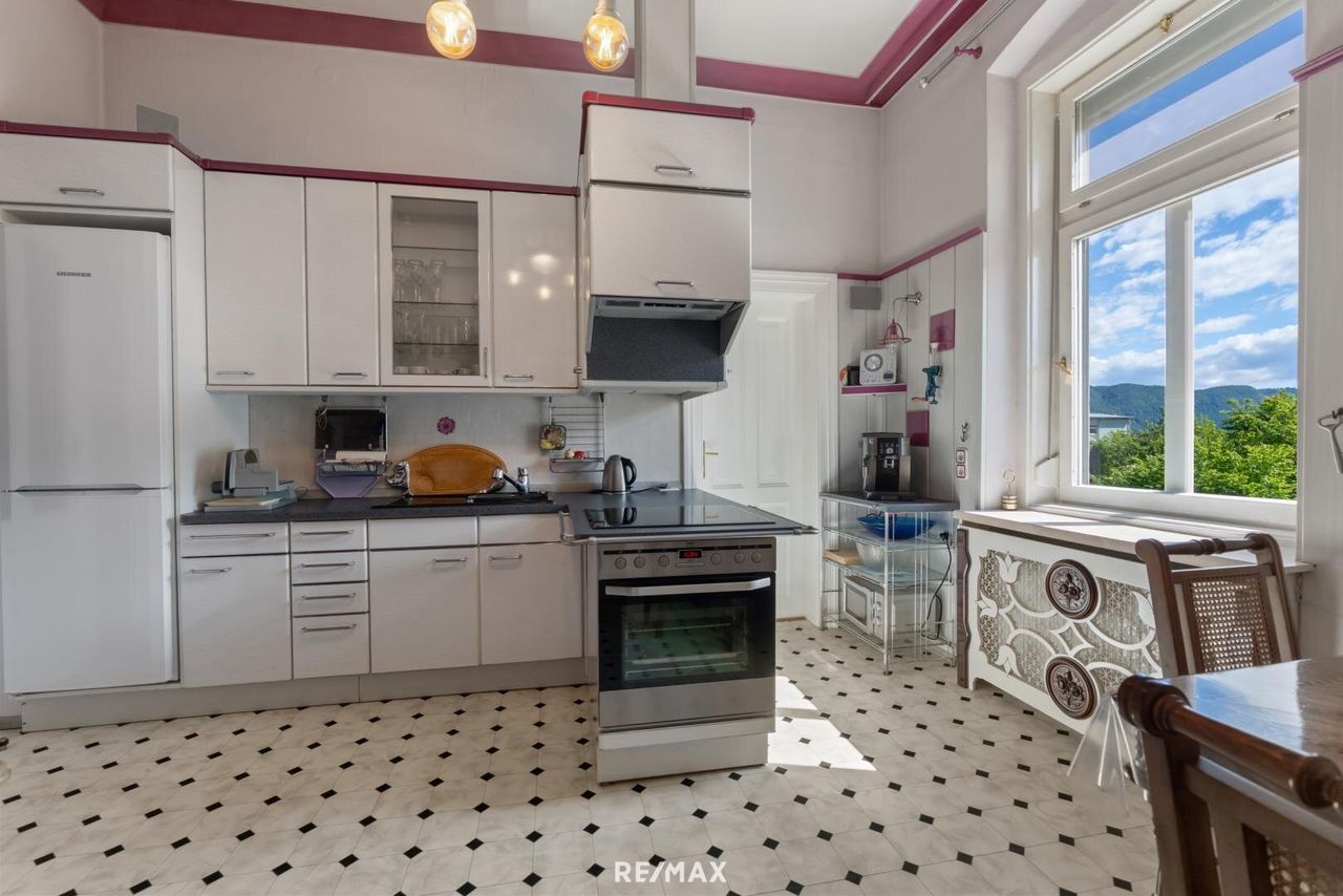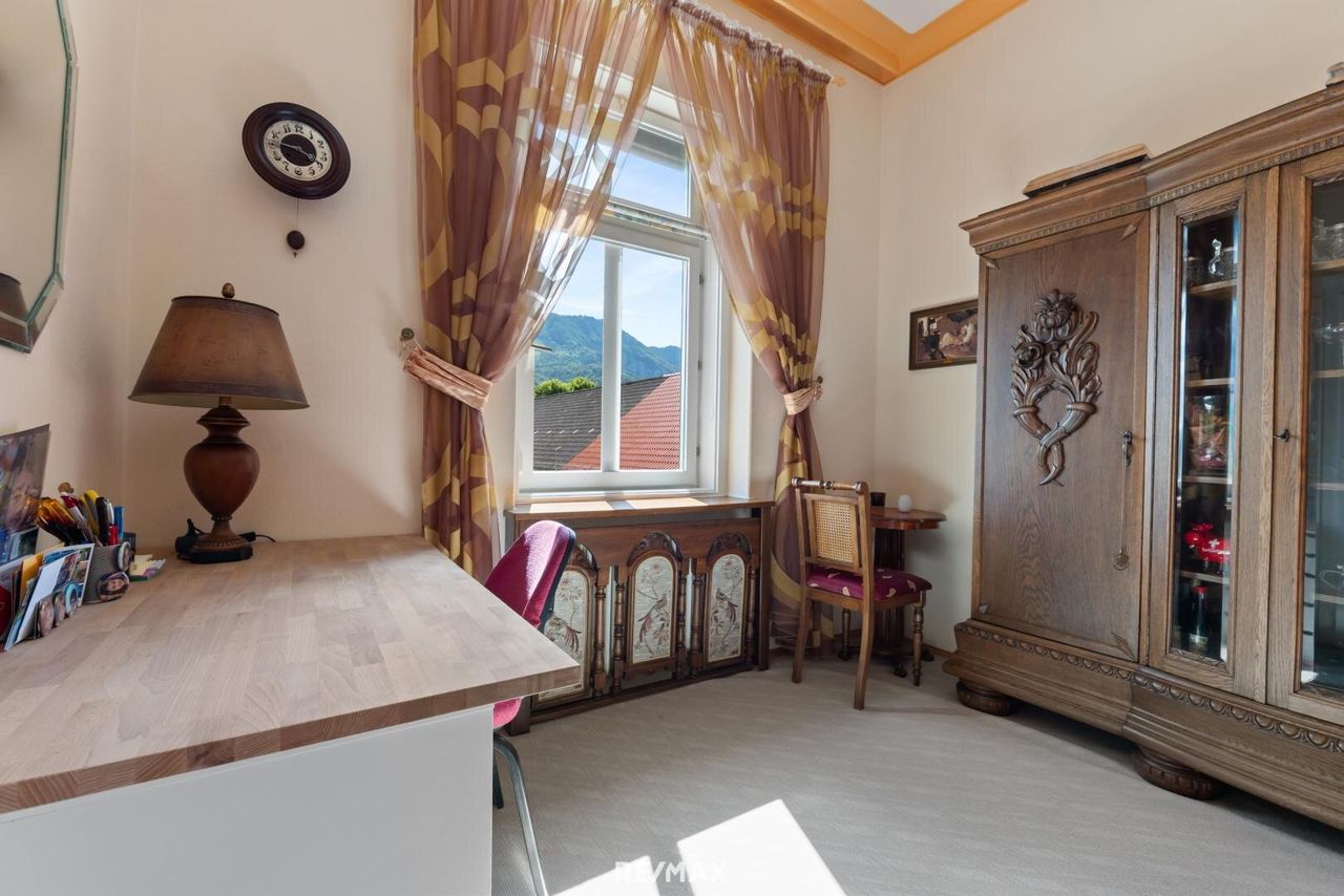 Großzügige Wohnung mit schönem Garten in Ferlach Diese einzigartige Wohnung befindet sich in ruhiger Lage in Ferlach und bietet mit ca. 164 m² Wohnfläche und einem ca. 200 m² großen, schönen Garten ein perfektes Zuhause. Ein Gartenhaus und zwei Carports runden das Angebot ab. Die Eigentumswohnung liegt im 1. Stock eines gepflegten Gebäudes und überzeugt durch ein lichtdurchflutetes Raumklima dank großer Fensterflächen und einer beeindruckenden Raumhöhe von ca. 3,30 m. Der südlich ausgerichtete, besonders großzügige Salon schafft ein exklusives Ambiente. Direkt angrenzend befindet sich das ca. 44 m² große Wohnzimmer, ebenfalls südseitig gelegen. Drei weitere Zimmer, eines davon mit begehbarer...