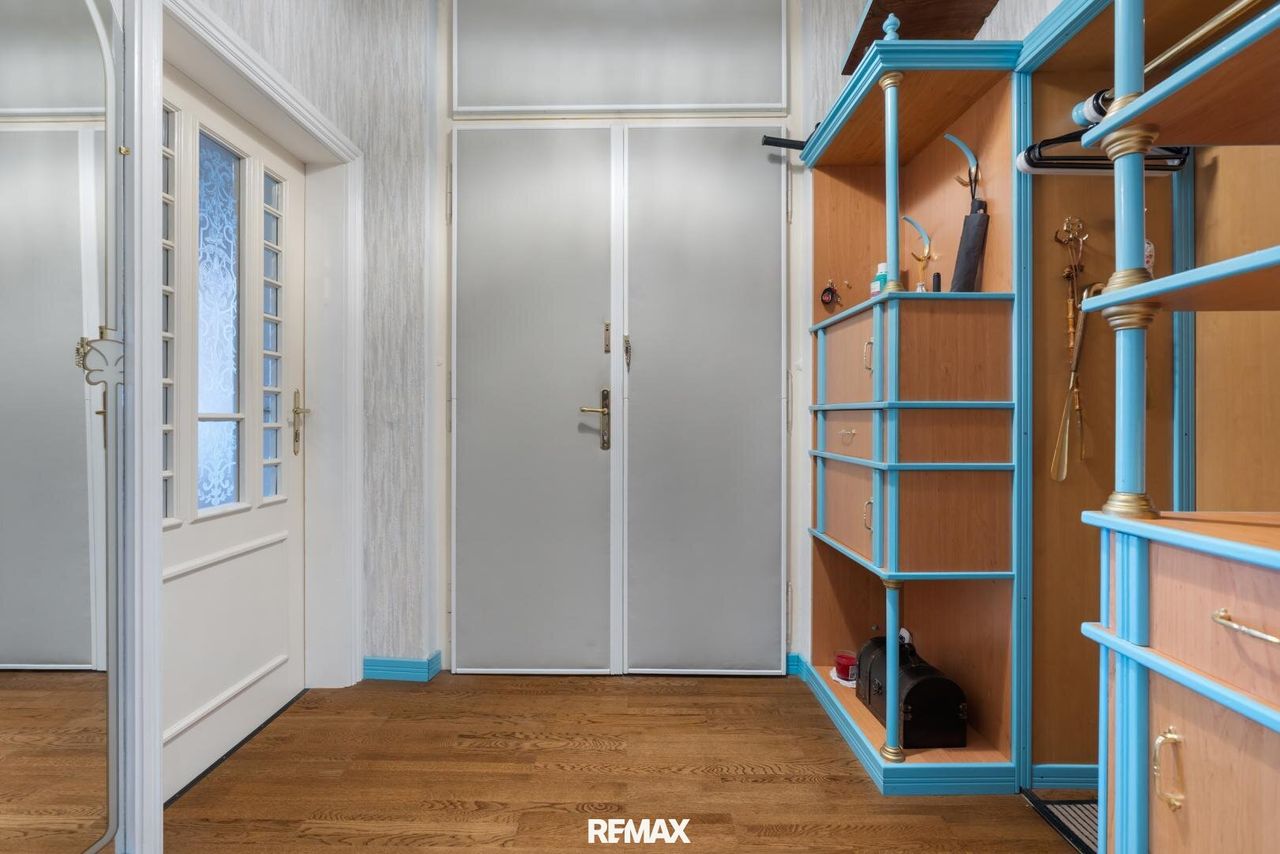 Der südlich ausgerichtete, besonders großzügige Salon schafft ein exklusives Ambiente. Direkt angrenzend befindet sich das ca. 44 m² große Wohnzimmer, ebenfalls südseitig gelegen. Drei weitere Zimmer, eines davon mit begehbarer Garderobe, bieten vielfältige Nutzungsmöglichkeiten. Eine Küche mit Essbereich, ein Tageslichtbad mit offener Dusche sowie ein separates WC vervollständigen das stimmige Raumkonzept.