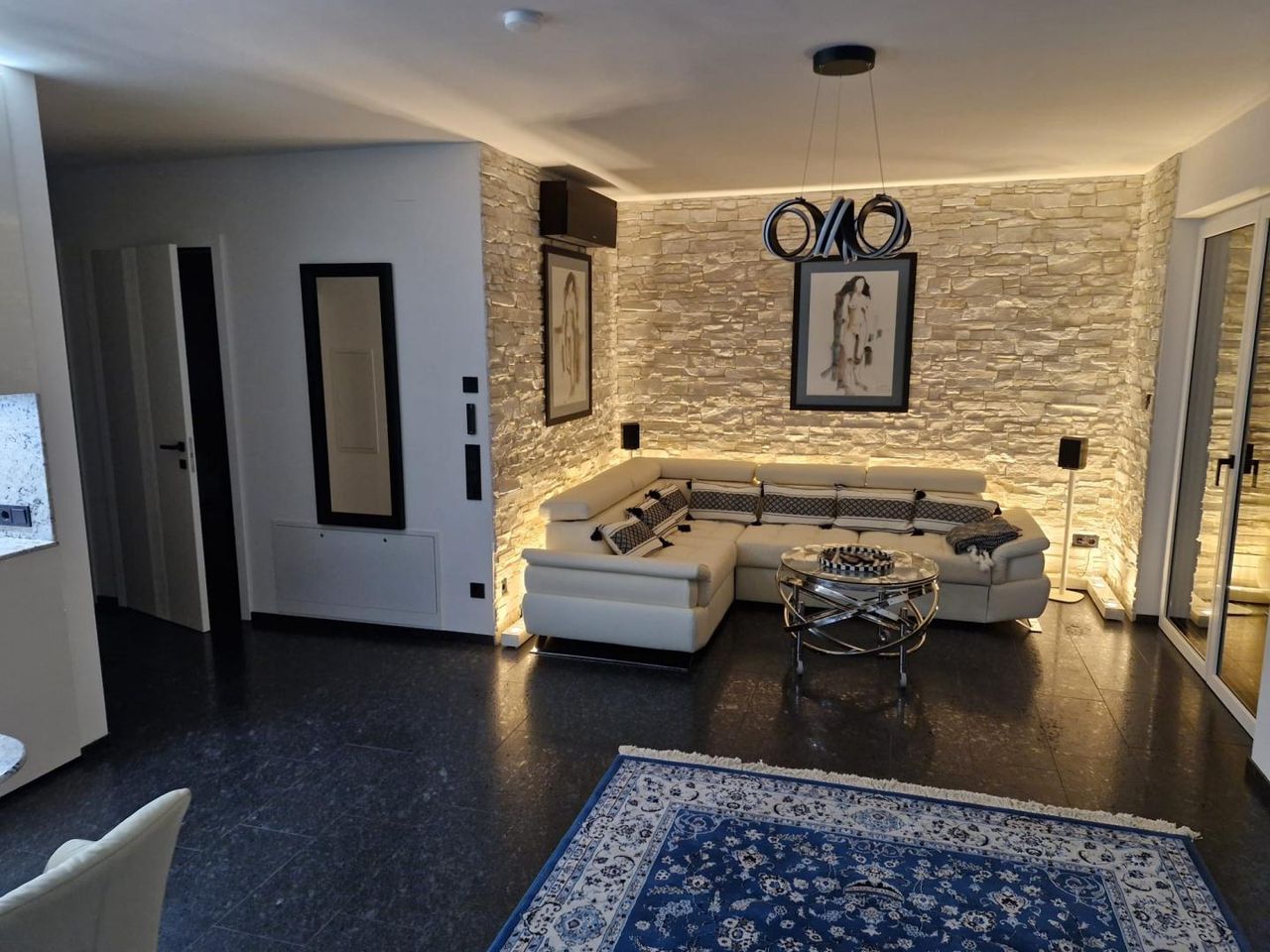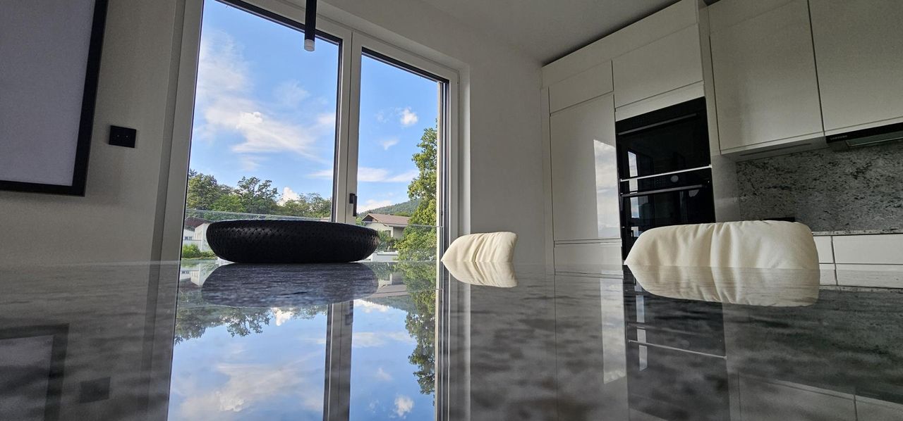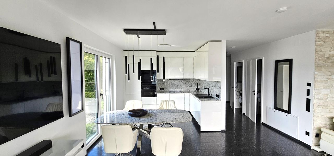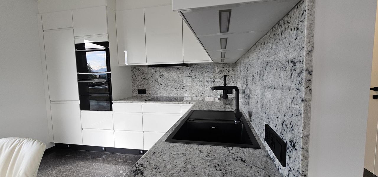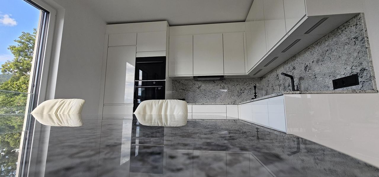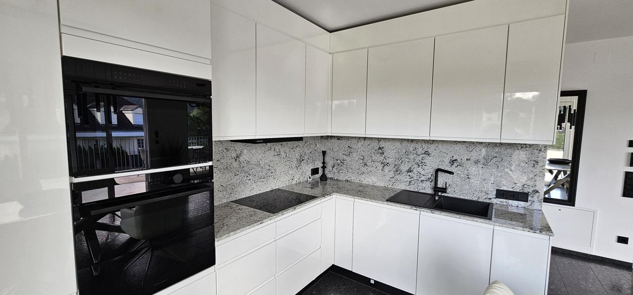 Die exklusive hochglanz Küche verfügt über eine Arbeitsplatte aus Granulit und eine Granulitrückwand. In der Bodenleiste wurde eine LED Beleuchtung verbaut.