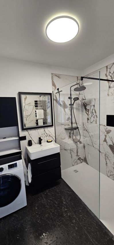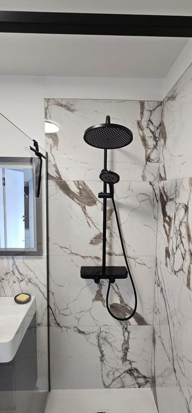 - Großformatige, hochwertige Fliesen im Badezimmer