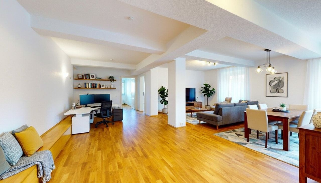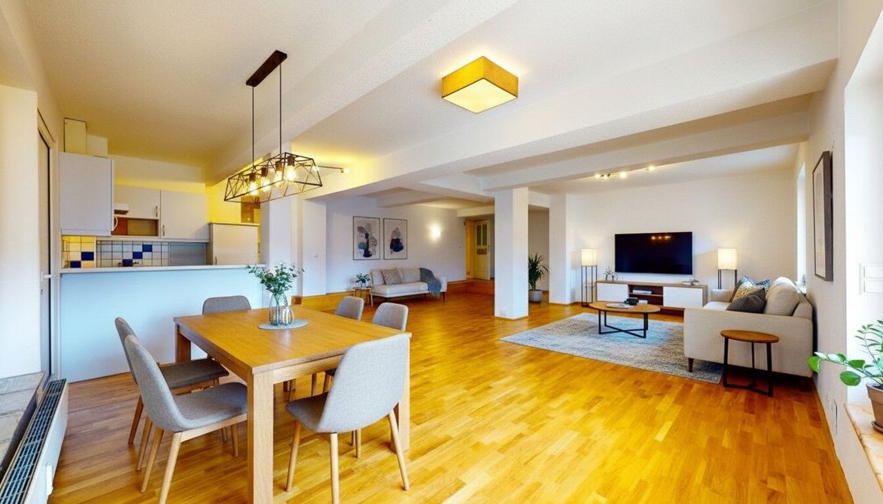 Das Herzstück der Wohnung ist der beeindruckende Wohn-, Ess- und Kochbereich mit ca. 60,10 m². Diese außergewöhnliche Fläche schafft ein offenes, luftiges Wohngefühl und bietet beste Voraussetzungen für stilvolles Wohnen, gesellige Abende mit Gästen oder ein modernes Wohnkonzept mit integriertem Homeoffice-Bereich. Die großflächige Raumgestaltung verleiht der Wohnung eine besondere Präsenz und eröffnet zahlreiche Möglichkeiten...
