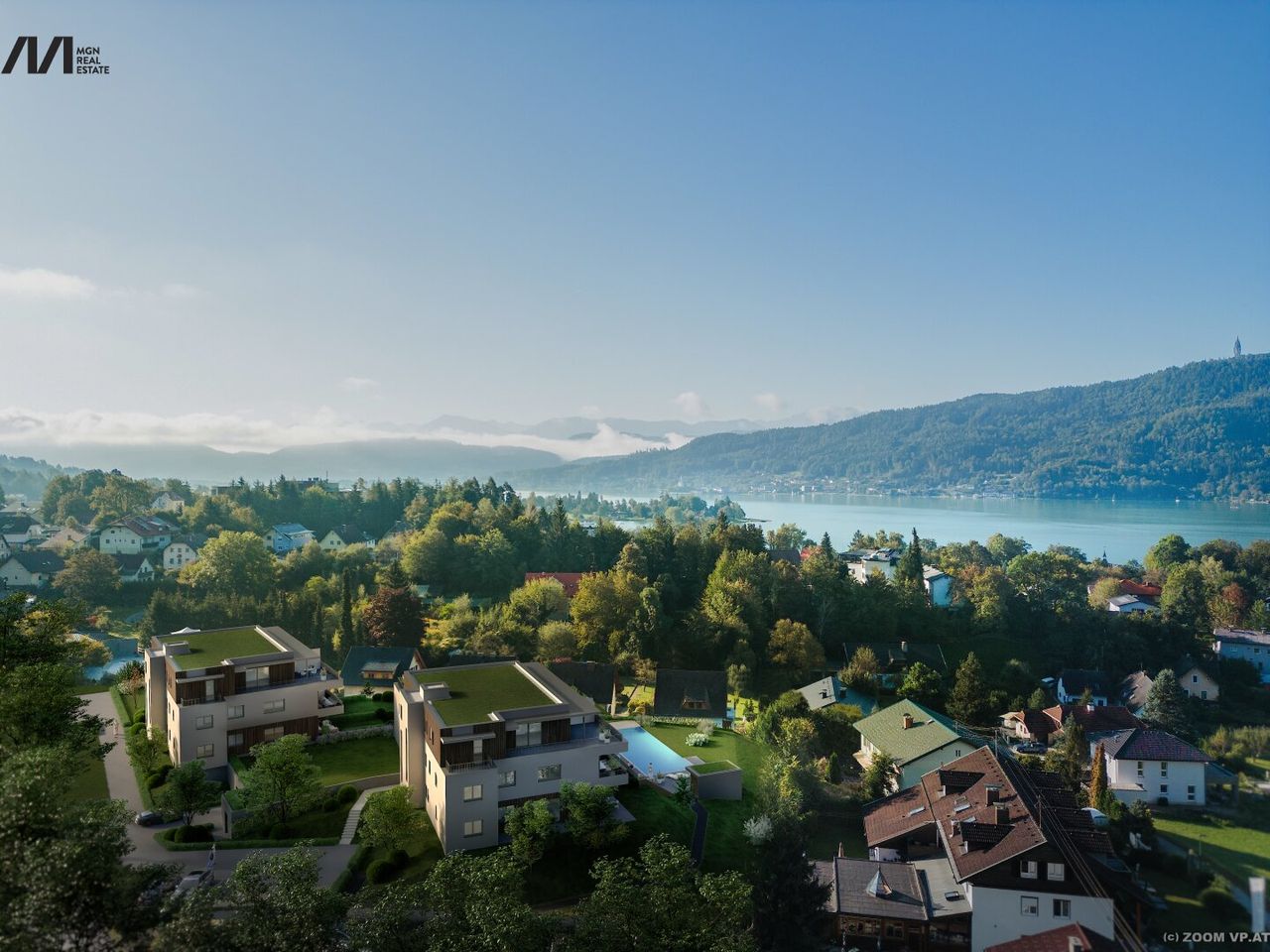 Von jeder Wohnung fällt der Blick frei über den Wörthersee und die Karawanken; Bodentiefe Glasfronten fangen das Licht des Südens ein und schaffen fließende Übergänge zwischen Innen und Außen.