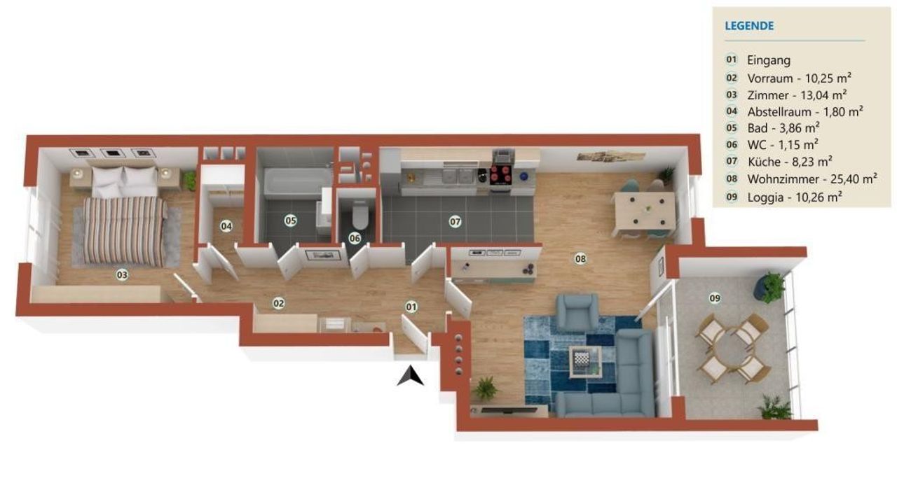 Vom Wohn-Esszimmer aus gelangt man auf die ca. 10m² große Loggia welche südseitig ausgerichtet ist. Weiters gehört zur Wohnung noch ein großes Kellerabteil (ca. 9m²) und ein Parkplatz unter einem Carport.