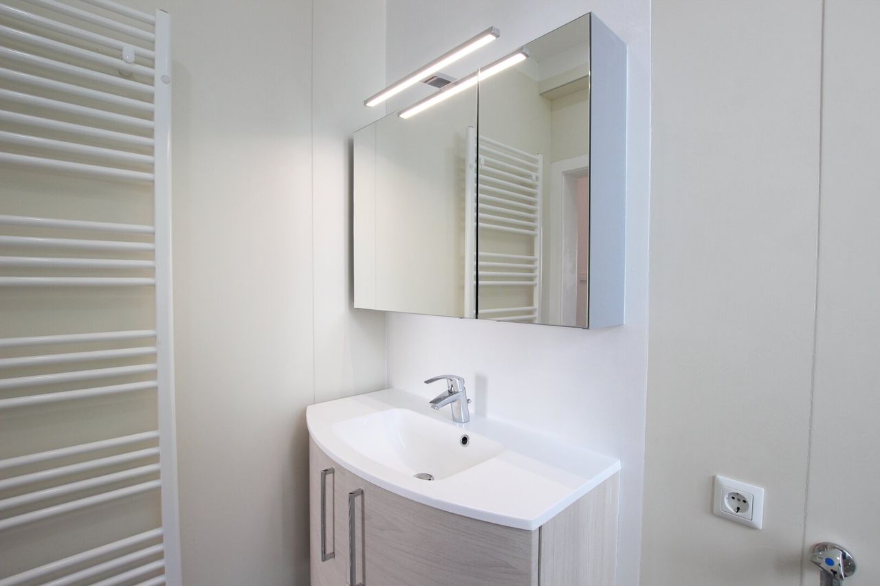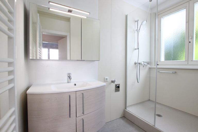 Das Badezimmer ist mit Dusche, Handtuchheizkörper und Waschmaschinenanschluss ausgestattet. Außerdem sorgt ein attraktiver Waschtisch und Spiegelschrank für Komfort im Badezimmer.