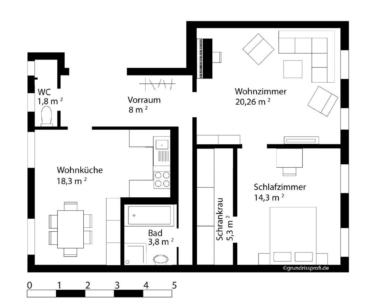 Raumaufteilung: Vorraum/Gang, Wohnzimmer mit Ausgang auf den Balkon, Schlafzimmer, Schrankraum, Badezimmer, Küche mit Essbereich, Separates WC