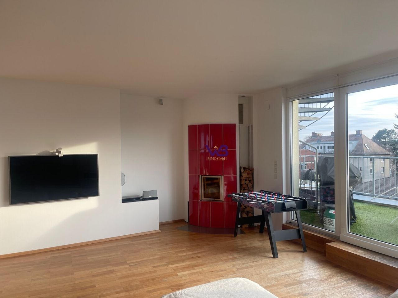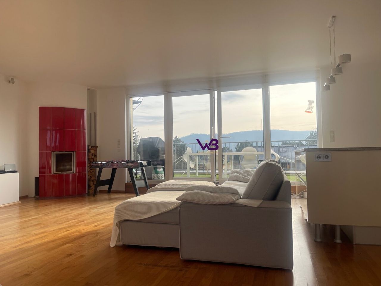 - Großzügiger Wohnessbereich (57m²) mit Einbauküche, Kamin und Balkonausgang (26m²)