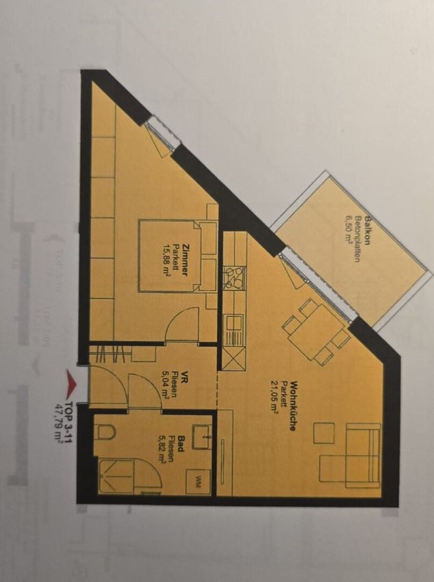 - Wohn/Ess/Küche mit Zugang zum Balkon (6,5m², nach Osten gerichtet) 21,05m², mit Parkettboden ausgestattet