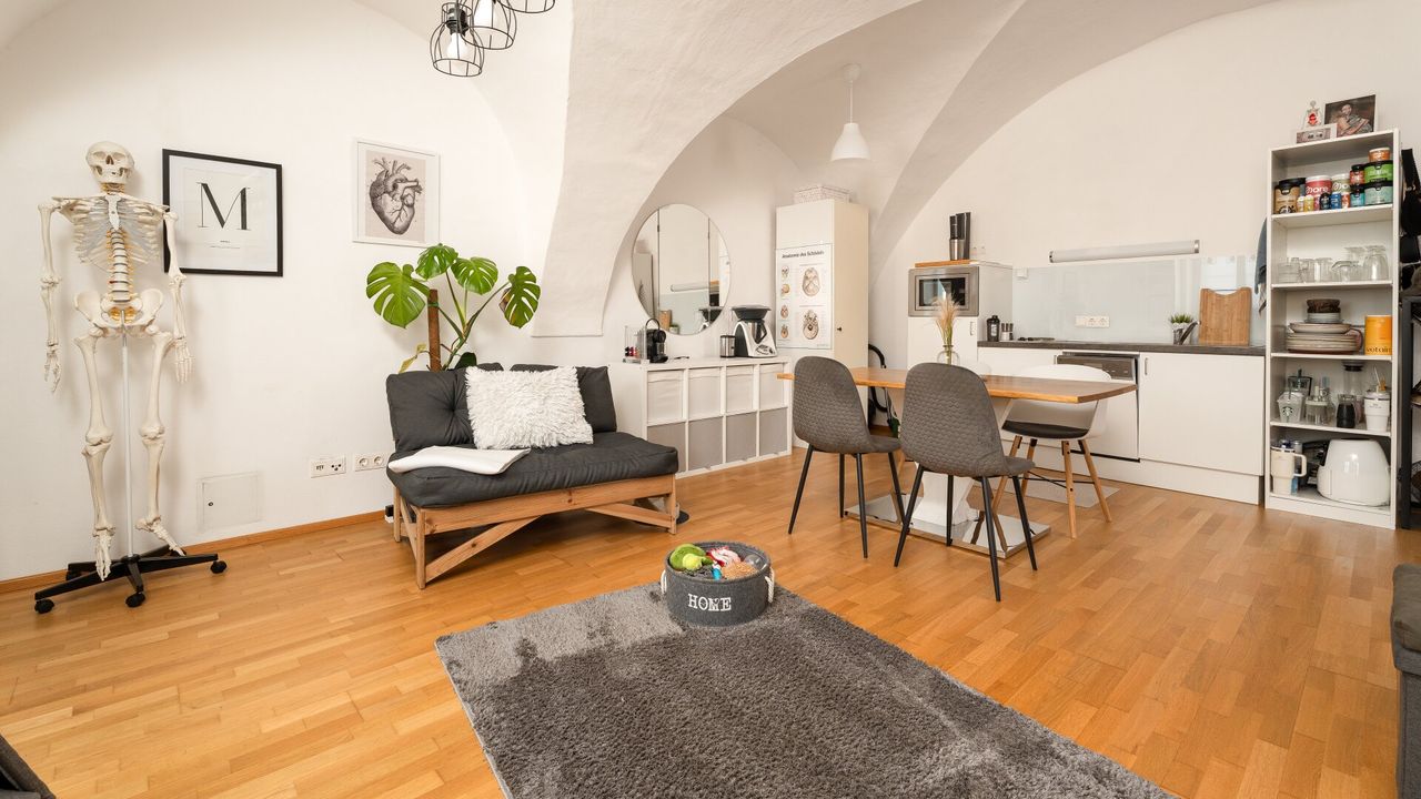 Diese Wohnung ist klein aber fein - sie bietet 1 Zimmer, in welchem sich Wohnen, Schlafen und Essen vereinen lassen, das Badezimmer ist tiefer gelegen und über ein paar Stufen begehbar. Dieses ist mit Dusche, Handwaschbecken und Waschmaschinenanschluss ausgestattet.