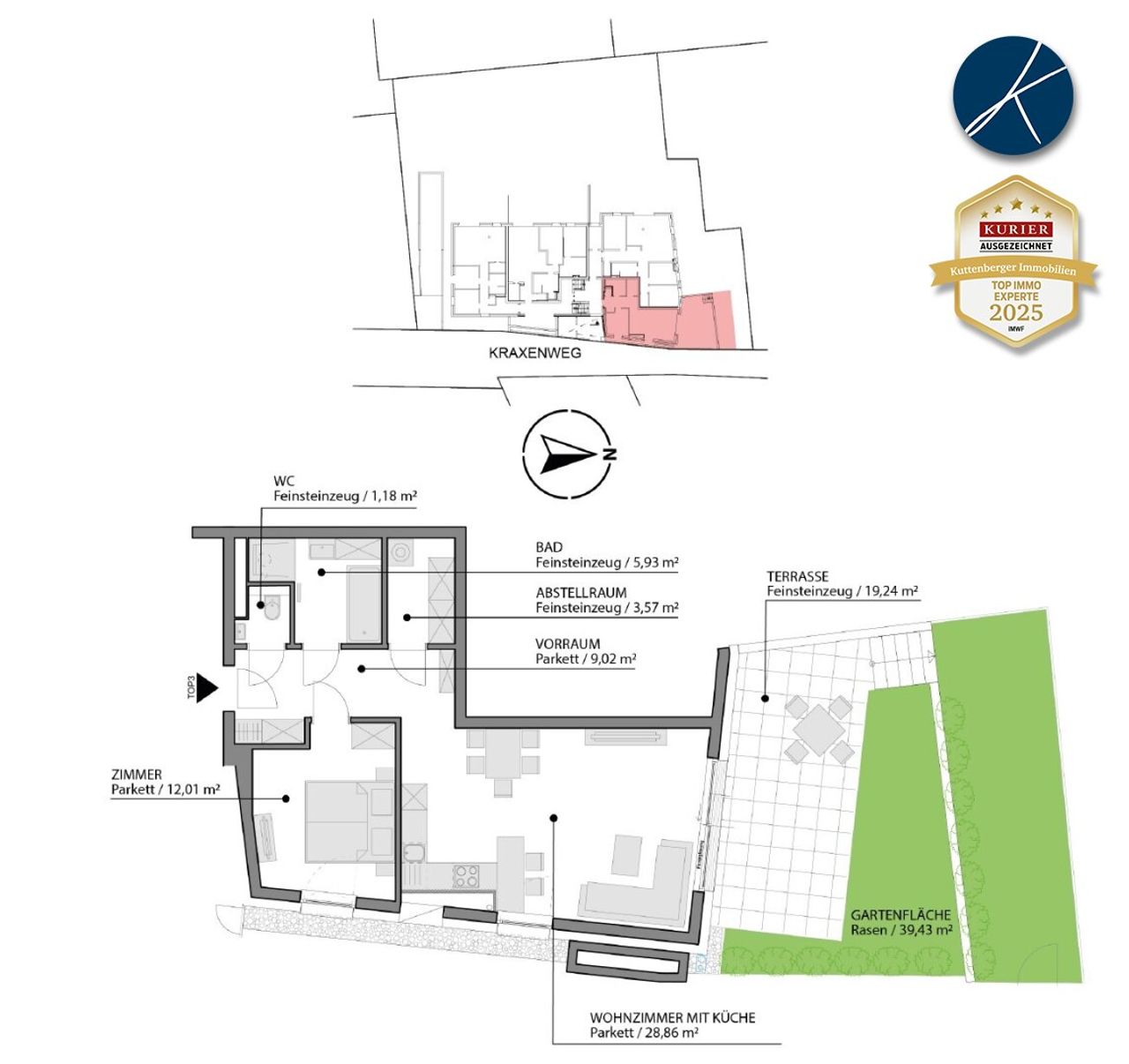 - Top 3 (EG): 2 Zimmer / 60,57 m² Wohnfläche + 58,67 m² Garten/Terrasse - Kaufpreis € 399.000,-